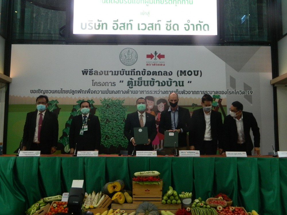 ดังนั้นกระทรวงเกษตรและสหกรณ์ ได้มอบหมายให้หน่วยงานในสังกัดที่เกี่ยวข้องเร่งดำเนินการป้องกัน ควบคุม แก้ไขปัญหา และบรรเทาผลกระทบจากโรคติดเชื้อไวรัส โคโรนา 2019 (COVID-19) ให้เป็นไปอย่างมีประสิทธิภาพและประสิทธิผล เพื่อไปดำเนินการที่ก่อให้เกิด การจัดซื้อจัดจ้างจากผู้ประกอบการหรือผู้ผลิตรายย่อย รวมถึงการจ้างแรงงาน ทางกระทรวงเกษตรฯ โดยกรมส่งเสริมการเกษตรจึงได้ร่วมกับ บริษัท อีสท์ เวสท์ ซีด จำกัด (ศรแดง) จัดทำ “โครงการตู้เย็นข้างบ้านต้านโควิด-19″ แจกฟรีเมล็ดพันธุ์ผักสวนครัวแก่เกษตรกรและประชาชนทั่วไป 1 ชุด เป้าหมาย 10,000 ราย ประกอบด้วยเมล็ดพันธุ์ ผักบุ้ง แตงกวา โหระพา พริกขี้หนู มะเขือพวง เป็นต้น ซึ่งเป็นความร่วมมือระหว่างหน่วยงานของรัฐ และภาคเอกชน โดยไม่ได้ใช้งบประมาณแผ่นดินแม้แต่บาทเดียว เปิดให้ประชาชนลงทะเบียนผ่านเว็บไซต์ของกรมส่งเสริมการเกษตร เมื่อวันที่ 7 พฤษภาคม ที่ผ่านมา ปรากฏว่าได้รับความสนใจจากประชาชนเป็นจำนวนมากในเวลาอันรวดเร็ว