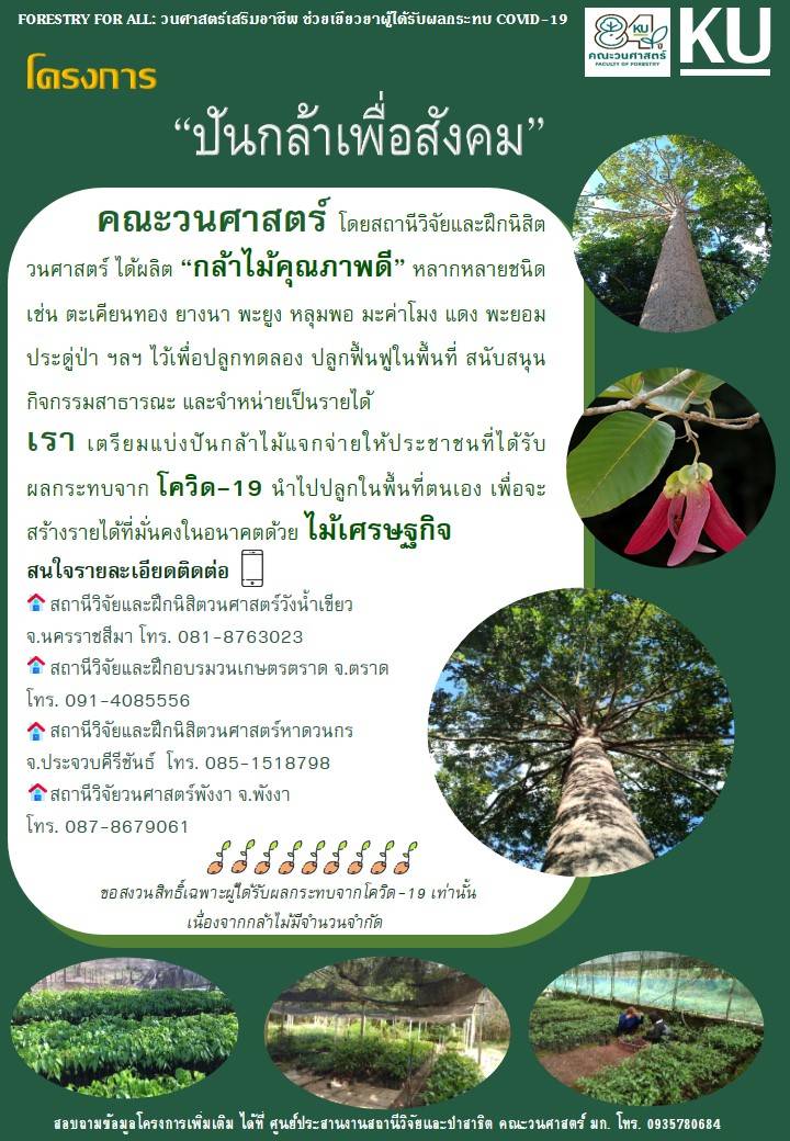 ดังนั้น คณะวนศาสตร์ ซึ่งมีหน่วยงานสถานีวิจัยและฝึกนิสิตวนศาสตร์กระจายอยู่ทั่วภูมิภาคของประเทศไทยจำนวน 8 แห่ง และมีกิจกรรมผลิตกล้าไม้ประจำปีเพื่อนำไปปลูกทดลอง ปลูกฟื้นฟูในพื้นที่สถานีวิจัย สนับสนุนกิจกรรมสาธารณะของโรงเรียน วัด หน่วยงานราชการ และจำหน่ายเป็นรายได้มาอย่างต่อเนื่อง จึงได้จัดโครงการ “ปันกล้าเพื่อสังคม” แบ่งปันกล้าไม้ที่มีอยู่ในเรือนเพาะชำของสถานีวิจัยให้กับประชาชนที่ได้รับความเดือนร้อนได้นำไปปลูกในพื้นที่ตนเอง ซึ่งอย่างน้อยเป็นการช่วยเสริมให้กับประชาชนสามารถมีรายได้ในอนาคตจากไม้เศรษฐกิจอีกทางหนึ่ง และยังช่วยให้พื้นที่ป่าของประเทศเพิ่มมากขึ้นด้วยกล้าไม้ดังกล่าว