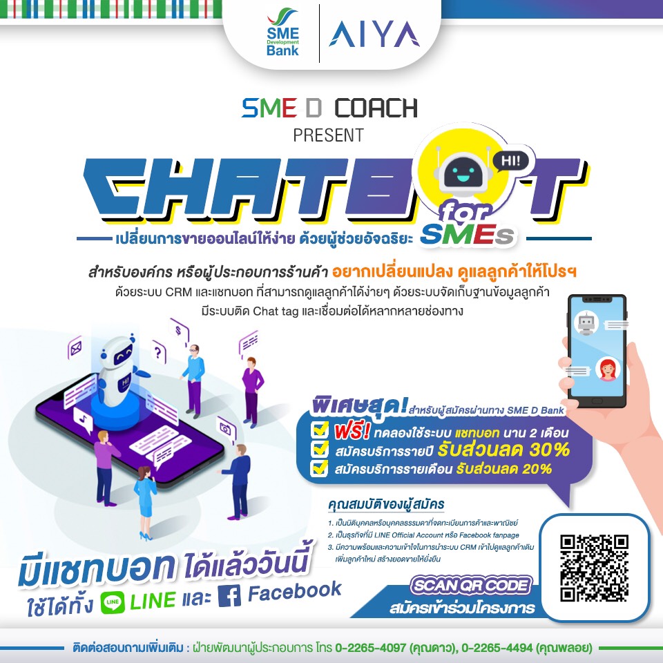 ธนาคารพัฒนาวิสาหกิจขนาดกลางและขนาดย่อมแห่งประเทศไทย(ธพว.) หรือ SME D Bank ร่วมมือกับ บริษัท มีจีเนียส จำกัด (AIYA) สนับสนุนผู้ประกอบการไทยดูแลลูกค้าอย่างมือโปร ภายใต้โครงการ “SME-D Coach Chatbot for SMEs เปลี่ยนการขายออนไลน์ให้ง่าย ด้วยผู้ช่วยอัจฉริยะ”