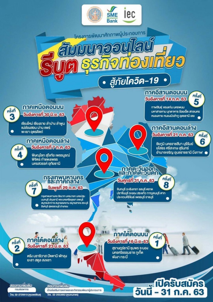 ธพว. ผนึก กรมสรรพากร และ IEC ปูพรมเติมความรู้คู่ทุน จัดสัมมนาออนไลน์ “รีบูตธุรกิจท่องเที่ยว สู้ภัยโควิด-19” ฟรี หนุนเอสเอ็มอีธุรกิจท่องเที่ยวทั่วไทย เข้าสู่มาตรการบัญชีเดียวควบคู่เข้าถึงสินเชื่อรายเล็ก Extra Cash ดอกเบี้ยพิเศษ ไม่ต้องใช้หลักทรัพย์ค้ำประกัน เพื่อเป็นทุนหมุนเวียนเสริมสภาพคล่อง ฟื้นฟูธุรกิจ