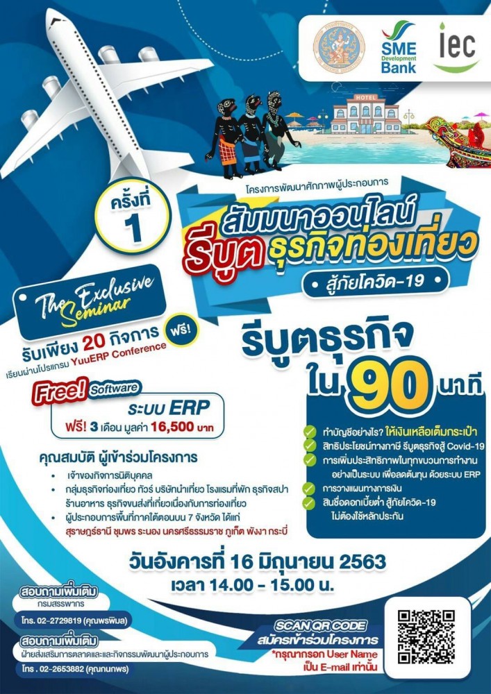 ส่วนการจัดสัมมนาออนไลน์ครั้งแรก ในวันที่ 16 มิ.ย. นี้ จะเริ่มจากพื้นที่ภาคใต้ตอนบน 7 จังหวัด ได้แก่ สุราษฎร์ธานี ชุมพร ระนอง นครศรีธรรมราช กระบี่ พังงา และภูเก็ต ผ่านโปรแกรม YuuERP Conference โดยผู้ที่เข้าร่วมจะได้เรียนรู้การทำธุรกิจง่ายใน 90 นาที เช่น ทำบัญชีอย่างไร? ให้เงินเหลือเต็มกระเป๋า, สิทธิประโยชน์ทางภาษี รีบูตธุรกิจสู้ โควิด-19, การเพิ่มประสิทธิภาพทุกขบวนการทำงานอย่างเป็นระบบเพื่อลดต้นทุนด้วยระบบERP สินเชื่อดอกเบี้ยต่ำ สู้ภัยโควิด-19 ไม่ต้องใช้หลักประกัน รับเพียง 20 กิจการเท่านั้น