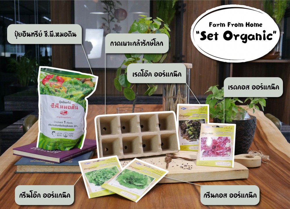 ชุดปลูกผักออร์แกนิค Farm From Home มาพร้อมคู่มือการปลูกโดยละเอียดบนกล่อง และภายในกล่องประกอบด้วย 1.เมล็ดพันธุ์ผักสลัดออร์แกนิค4 ชนิด ได้แก่ เมล็ดพันธุ์เรดโอ๊ค กรีนโอ๊ค เรดคอส และกรีนคอส, 2.ปุ๋ยอินทรีย์ ซี.พี. หมอดินปุ๋ยอินทรีย์อัดเม็ดคุณภาพ ผ่านการวิจัยว่าเหมาะสำหรับพืชผักและดอกไม้ สะอาด ใช้งานง่าย ไม่ส่งกลิ่นเหม็นกวนใจ สามารถผสมในดินเพื่อเพิ่มธาตุอาหารและอินทรียวัตถุในดิน, และ3.ถาดเพาะกล้ารักษ์โลก 4 ชิ้น ซึ่งผลิตจากวัสดุที่สามารถย่อยสลายได้โดยธรรมชาติหลังจากการปลูก จึงช่วยลดขยะพลาสติก และยังเป็นมิตรต่อสิ่งแวดล้อม