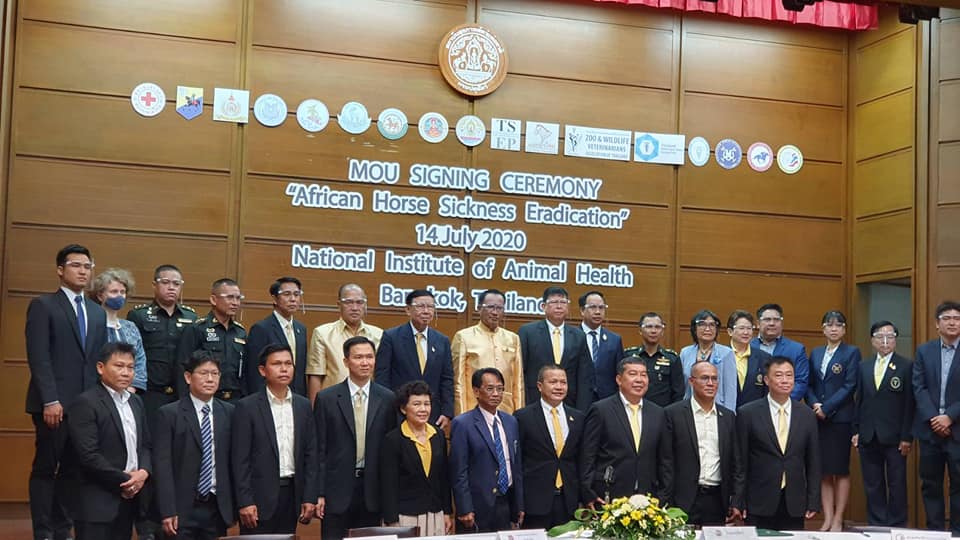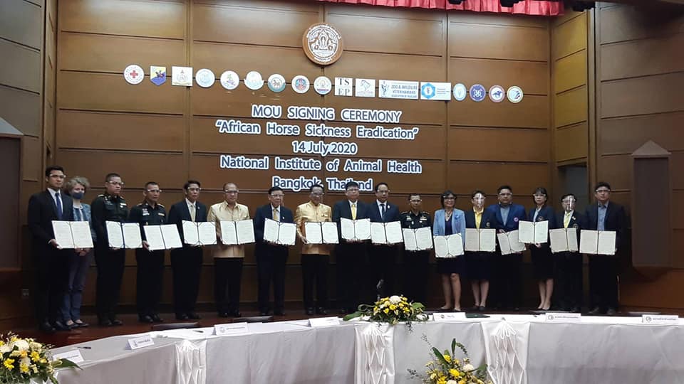 วันที่ 14 กรกฎาคม 2563 เวลา 9.00 น. นายสัตวแพทย์สรวิศ ธานีโต อธิบดีกรมปศุสัตว์ เป็นประธานในพิธีลงนามในบันทึกข้อตกลง (Memorandum Of Understanding) การกำจัดโรคกาฬโรคแอฟริกาในม้า (African Horse Sickness) ของประเทศไทย ตามหลักความร่วมมือระหว่างภาครัฐและเอกชน (Public Private Partnership, PPP) ขององค์การสุขภาพสัตว์โลก (OIE) ร่วมกับภาคีเครือข่าย 16 หน่วยงาน เพื่อกำจัดโรคกาฬโรคแอฟริกาในม้าให้หมดไปจากประเทศไทย และได้รับสถานะประเทศปลอดโรคกลับคืนมาในที่สุด ณ ห้องประชุม ดร.ทิม พรรณศิริ สถาบันสุขภาพสัตว์แห่งชาติ เขตบางเขน กรุงเทพฯ
