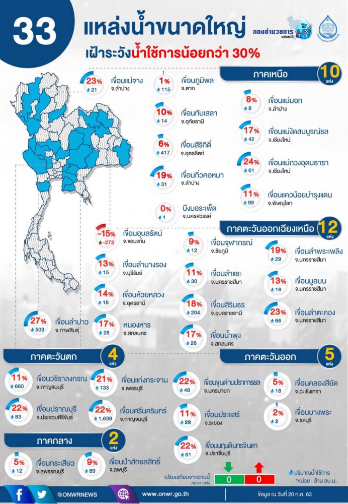 ดังนั้น เพื่อให้เหมาะสมสอดคล้องกับสถานการณ์น้ำดังกล่าว และเร่งเก็บกักน้ำต้นทุนให้มากที่สุด กรมชลประทานและการไฟฟ้าฝ่ายผลิตแห่งประเทศไทย (กฟผ.) คณะทำงานภายใต้ กอนช. ได้พิจารณาปรับลดการระบายน้ำจากเขื่อนภูมิพล จ.ตาก ในช่วงวันที่ 22 – 28 ก.ค.63 ลงวันละ 1 ล้าน ลบ.ม.จากอัตราเฉลี่ยวันละ 5 ล้าน ลบ.ม.เหลืออัตราเฉลี่ยวันละ 4 ล้าน ลบ.ม. โดยปริมาณน้ำในเขื่อนภูมิพลปัจจุบันมีทั้งสิ้น 3,911 ล้าน ลบ.ม. หรือ 29% เป็นปริมาณน้ำใช้ได้การ 111 ล้าน ลบ.ม. หรือ 1% ในช่วงวันที่ 15 – 21 ก.ค.มีปริมาณน้ำลงเขื่อนฯ แล้ว 10 ล้าน ลบ.ม. และคาดว่าในช่วงวันที่ 22 – 24 ก.ค.63 ประมาณน้ำจะเพิ่มขึ้นอีก 4 ล้าน ลบ.ม.