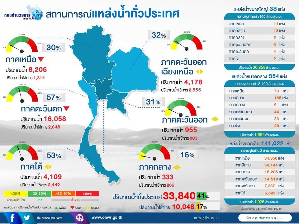 นายสำเริง แสงภู่วงค์ รองเลขาธิการสำนักงานทรัพยากรน้ำแห่งชาติ ในฐานะเลขานุการกองอำนวยการน้ำแห่งชาติ (กอนช.) เปิดเผยสถานการณ์น้ำภาพรวมของประเทศในวันนี้ (21 ก.ค.63) ว่า กอนช.ได้มีการวิเคราะห์ติดตามสภาพอากาศ และปริมาณฝนในสัปดาห์นี้ พบว่า ฝนจะเพิ่มขึ้นและกระจายตัวทั่วประเทศในช่วงวันที่ 21 – 22 ก.ค.63 และจะเริ่มลดลงในวันที่ 23- 24 ก.ค.63 ก่อนจะเพิ่มขึ้นอีกครั้งในช่วงวันที่ 25 – 26 ก.ค.นี้ ซึ่งจะส่งผลดีต่อปริมาณน้ำในแม่น้ำ ลำน้ำ แหล่งน้ำต่าง ๆ รวมถึงเขื่อนที่เริ่มมีปริมาณน้ำไหลลงอ่างฯ เพิ่มขึ้น เห็นได้ชัดเจนจากในช่วงสัปดาห์ที่ผ่านมา มีฝนตกเพิ่มขึ้นในพื้นที่ลุ่มน้ำเจ้าพระยาตอนบนและตอนล่าง ทำให้มีปริมาณน้ำท่าเพิ่มขึ้นและระดับน้ำเหนือเขื่อนเจ้าพระยาก็เพิ่มขึ้นด้วย ส่งผลให้สถานการณ์ในแม่น้ำเจ้าพระยาดีขึ้นโดยลำดับ