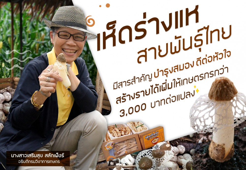 “เห็ดร่างแหสายพันธุ์ไทยมีกลุ่มสารสำคัญซึ่งมีคุณค่าทางโภชนาการสูง มีส่วนช่วยกระบวนการทำงานของกล้ามเนื้อหัวใจและสมอง มีประโยชน์ต่อผู้บริโภคในด้านเป็นอาหารบำรุงสุขภาพและบำบัดโรคเพื่อรองรับสังคมผู้สูงวัยและกลุ่มผู้รักสุขภาพ ในส่วนของวัสดุที่เหมาะสมต่อการเกิดดอกเมื่อผ่านกระบวนการเก็บผลผลิตแล้ว ยังสามารถนำมาใช้เป็นวัสดุปลูกให้แก่พืชผักได้อีกทางหนึ่ง เนื่องจากมีอินทรียวัตถุและสารอาหารที่พืชสามารถนำไปใช้ประโยชน์ต่อไปได้ หากสนใจเทคโนโลยีการเพาะเห็ดสายพันธุ์ไทยสามารถสอบถามรายละเอียดเพิ่มเติมได้ที่ ศูนย์วิจัยและพัฒนาการเกษตรสงขลา โทร.0-7458-6725” อธิบดีกรมวิชาการเกษตร กล่าว