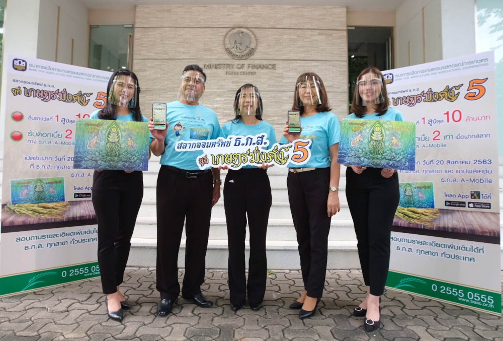 นางณิชา อวยพรรุ่งรัตน์ ผู้ช่วยผู้จัดการธนาคารเพื่อการเกษตรและสหกรณ์การเกษตร (ธ.ก.ส.)เปิดเผยว่า ธ.ก.ส.เปิดรับฝาก “สลากออมทรัพย์ ธ.ก.ส. ชุดเกษตรมั่งคั่ง 5”จำนวน 1,000 ล้านหน่วย หน่วยละ 100 บาท รวมวงเงิน 100,000 ล้านบาท เพื่อระดมเงินฝากจากประชาชนทั่วไปสำหรับนำไปใช้เป็นทุนสนับสนุนภาคเกษตรกรรม อันเป็นรากฐานที่สำคัญของประเทศ และเป็นการตอบสนองความต้องการของลูกค้าผู้ถือสลากออมทรัพย์ที่จะครบกำหนดไถ่ถอน ให้สามารถฝากเงินกับ ธ.ก.ส.ได้อย่างต่อเนื่องอีกทั้งยังเป็นทางเลือกสำหรับการออมเงินที่ได้รับดอกเบี้ยปลอดภาษีและยังมีสิทธิ์ลุ้นรางวัลมากมายโดยเปิดรับฝากตั้งแต่วันที่ 20สิงหาคม 2563 เป็นต้นไปณ ธ.ก.ส. ทุกสาขาทั่วประเทศและผ่านช่องทางแอปพลิเคชัน ธ.ก.ส. A-Mobile