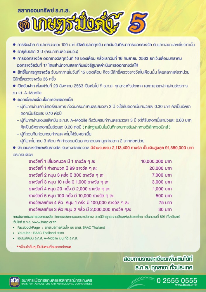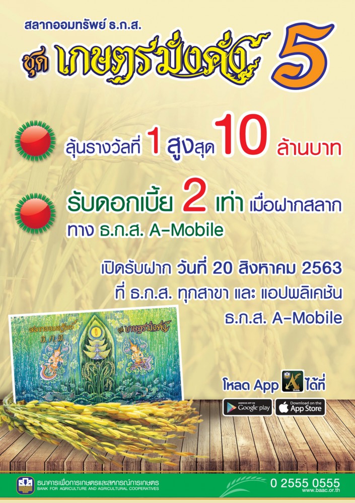 ธ.ก.ส. เปิดรับฝาก “สลากออมทรัพย์ ธ.ก.ส. ชุดเกษตรมั่งคั่ง 5” หน่วยละ 100 บาทจำนวน 1,000 ล้านหน่วยวงเงิน 100,000 ล้านบาท ฝากครบ 3 ปีได้รับดอกเบี้ยหน่วยละ 0.30 บาท พิเศษ! ฝากผ่าน ธ.ก.ส. A-Mobile รับดอกเบี้ยหน่วยละ 0.60 บาท พร้อมลุ้นรางวัลที่ 1 สูงสุด 10 ล้านบาทรวมมูลค่ากว่า 91 ล้านบาทต่อเดือนเปิดรับฝาก 20 สิงหาคมนี้ ที่ ธ.ก.ส. ทุกสาขาและผ่านทาง ธ.ก.ส. A-Mobile