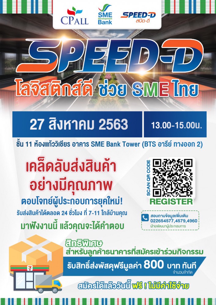 ธนาคารพัฒนาวิสาหกิจขนาดกลางและขนาดย่อมแห่งประเทศไทย (ธพว.) หรือ SME D Bankสถาบันการเงินของรัฐ เพื่อเอสเอ็มอีไทย พร้อมยกระดับลูกค้าธนาคาร ด้วยแนวคิด “เติมความรู้คู่ทุน” เพื่อการพัฒนาตลอดเส้นทางธุรกิจ โดยร่วมกับบริษัท ซีพี ออลล์ จำกัด (มหาชน) จัดสัมมนา“Speed-D โลจิสติกส์ดี ช่วย SME ไทย”ในวันพฤหัสบดีที่ 27 สิงหาคม 2563 ตั้งแต่เวลา 13.00-15.00 น. ชั้น11 ห้องแก้ววิเชียร อาคาร SME Bank Tower สำนักงานใหญ่ ภายในงานมีการนำเสนอข้อมูลระบบการขนส่งของ Speed-D ทางเลือกใหม่ให้กับธุรกิจเอสเอ็มอีในการขนส่งสินค้าถึงมือผู้บริโภคที่สะดวก รวดเร็ว ลดต้นทุนในการขนส่ง เพราะไม่ว่าจะอยู่ส่วนไหนของประเทศ ก็สามารถรับ-ส่งสินค้าได้ง่าย ๆ ที่ร้านค้าสะดวกซื้อ 7-ELEVEN ใกล้บ้านคุณเปิดให้บริการตลอด24 ชั่วโมง