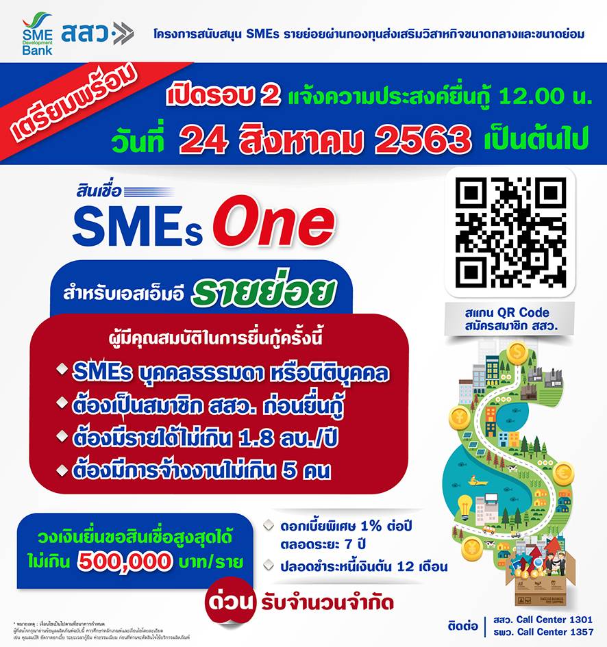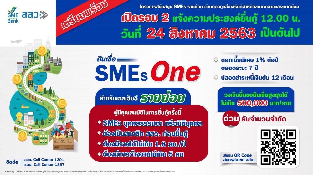สสว. และ ธพว. เตรียมเปิดรับยื่นขอกู้สินเชื่อ “SMEs One” รอบ 2 วงเงินรวม 1,200 ล้านบาท สำหรับกลุ่มรายย่อย รายได้ไม่เกิน 1.8 ลบ.ต่อปี จ้างงานไม่เกิน 5 คน วงเงินกู้สูงสุด 5 แสนบาท ดอกเบี้ย 1% ต่อปี ระบุเปิดรับผ่านช่องทางออนไลน์ ตั้งแต่เวลา 12.00 น. วันที่ 24 ส.ค. 63 เป็นต้นไป จนกว่าจะเต็มวงเงิน แนะผู้สนใจควรสมัครสมาชิก สสว.ให้เรียบร้อยก่อนวันเปิดยื่นกู้ ช่วยเพิ่มความสะดวกรวดเร็ว