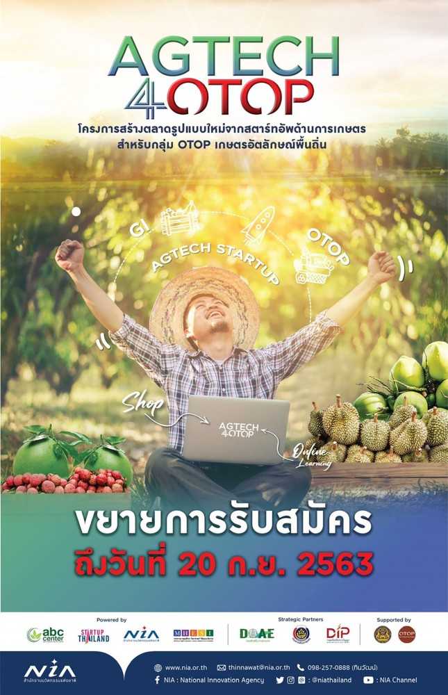 วันที่ 11 กันยายน 2563 สำนักงานนวัตกรรมแห่งชาติ (องค์กรมหาชน) หรือ NIA ขอเชิญชวนเกษตรกร ผู้ประกอบธุรกิจเกษตร ผู้ที่มีผลิตผลสินค้าเกษตรอัตลักษณ์ท้องถิ่น หรือผู้ผลิตสินค้าโอทอป เข้าร่วมบ่มเพาะเชิงปฏิบัติการในโครงการสร้างตลาดรูปแบบใหม่จากสตาร์ทอัพด้านการเกษตรสำหรับกลุ่ม OTOP เกษตรอัตลักษณ์พื้นถิ่น (AGTECH4OTOP) เพื่อทดสอบตลาดและเชื่อมโยงโอกาสในการทำธุรกิจสินค้าเกษตรอัตลักษณ์ท้องถิ่นที่มีศักยภาพออกสู่ตลาดบนแพลตฟอร์มของสตาร์ทอัพ และเพิ่มช่องทางค้าขายทั้งตลาดในประเทศและต่างประเทศให้มากยิ่งขึ้น