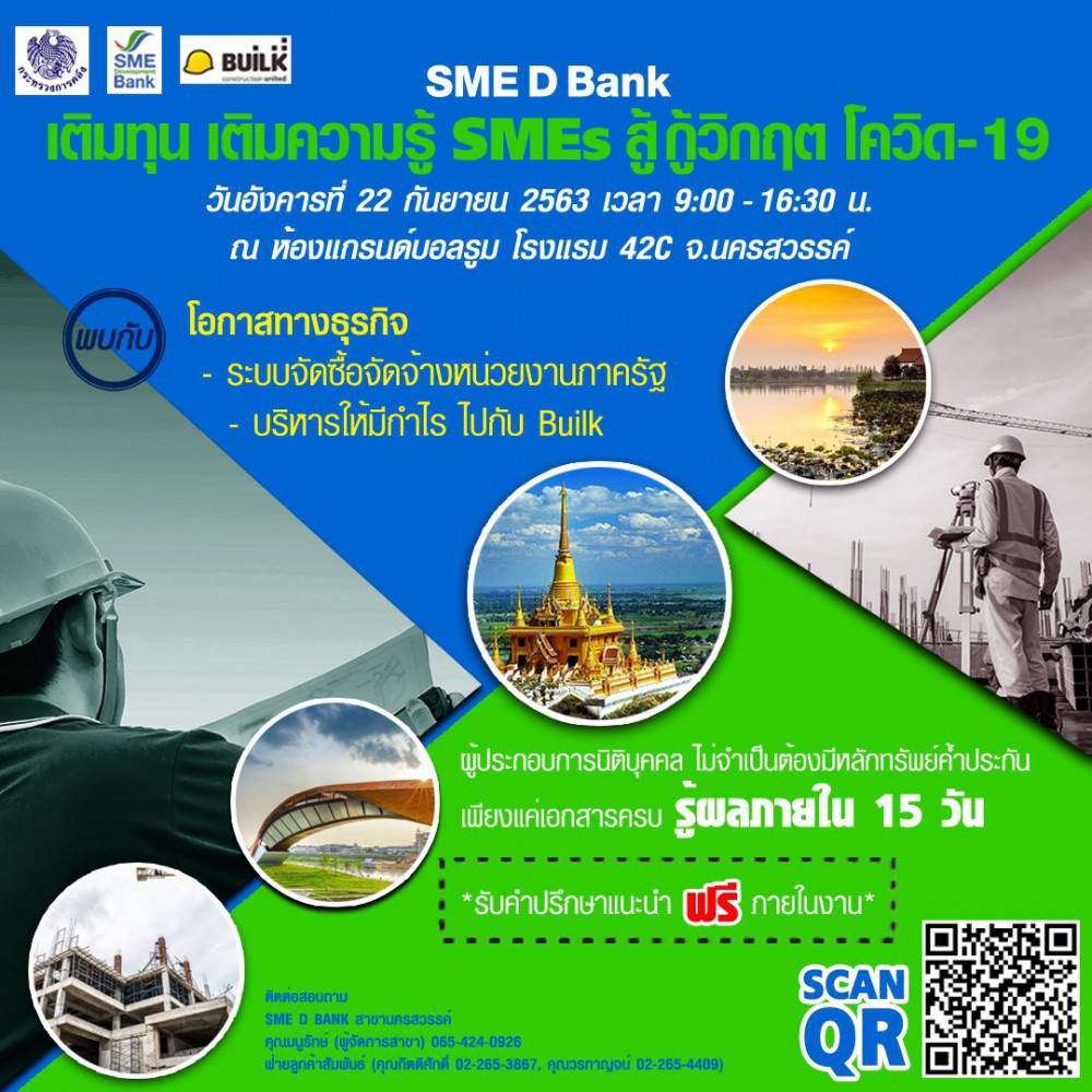 ธนาคารพัฒนาวิสาหกิจขนาดกลางและขนาดย่อมแห่งประเทศไทย (ธพว.) หรือ SME D Bank พร้อมเคียงข้างเอสเอ็มอีไทย เดินหน้าธุรกิจอย่างมั่นคงและยั่งยืน ร่วมกับ Builk One Group Co., Ltd. ผู้ให้บริการแพลตฟอร์มออนไลน์ สำหรับบริหารธุรกิจก่อสร้าง จัดกิจกรรม “SME D Bank เติมทุน เติมความรู้ SMEs สู้ กู้วิกฤตโควิด-19” ในวันที่ 22 กันยายน 2563 ตั้งแต่เวลา 09.00-16.30 น. ณ ห้องแกรนด์บอลรูม โรงแรม 42C จังหวัดนครสวรรค์
