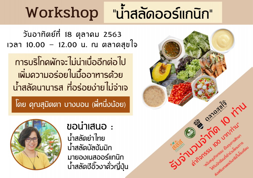 สำหรับเวิร์คช็อป “น้ำสลัดออร์แกนิก” มี 4 สูตรด้วยกัน ได้แก่ 1.น้ำสลัดยำไทย 2.น้ำสลัดบัลซามิก3.มายองเนส และ4.น้ำสลัดซีอิ๊วงาคั่วญี่ปุ่น แต่ละสูตรมีความโดดเด่นที่แตกต่างๆ กัน แต่ที่เหมือนกันคือ เน้นคัดสรรวัตถุดิบและเครื่องปรุงออร์แกนิก เพื่อสุขภาพที่ดี โดยเวิรร์คช็อปนี้ ได้รับเกียรติจากวิทยากร คนเก่ง คุณสุมิตตา บางบอน ผู้ชื่นชอบการทำอาหารเพื่อสุขภาพทานเองในครอบครัว และยังร่วมแบ่งปันความรู้ตามเวทีต่างๆอยู่เสมอจนเป็นที่รู้จักของคนสายคลีน