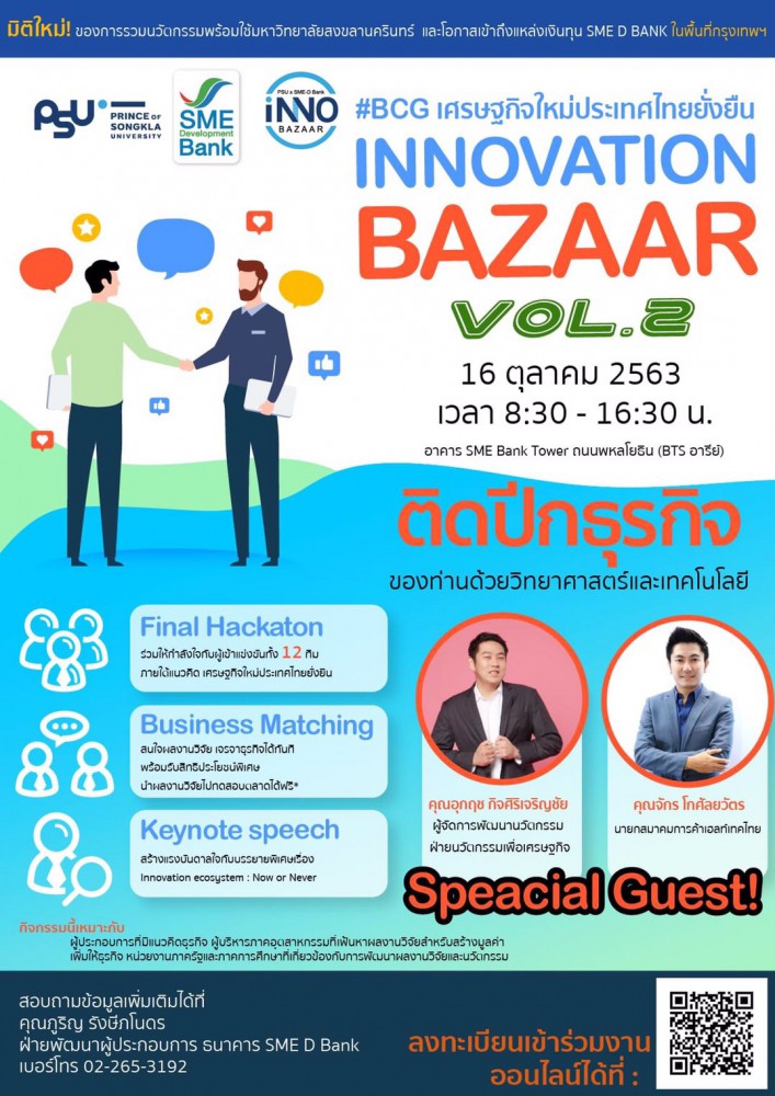 ธนาคารพัฒนาวิสาหกิจขนาดกลางและขนาดย่อมแห่งประเทศไทย (ธพว.) หรือSME D Bankร่วมกับมหาวิทยาลัยสงขลานครินทร์ (PSU)จัดงานมหกรรม “PSU x SME D Bank Innovation Bazaar” Vol.2 ในวันศุกร์ที่ 16 ตุลาคม 2563 เวลา 08.30-16.30 น. ณ ห้องแก้ววิเชียร ชั้น 11 สำนักงานใหญ่ SME Bank Tower ถือเป็นงานใหญ่ประจำปี 2563เปิดโอกาสผู้ประกอบการเอสเอ็มอีที่ต้องการนำผลงานวิจัยและนวัตกรรมพร้อมใช้ไปต่อยอดธุรกิจ เพื่อสร้างมูลค่าเพิ่มให้กิจการอย่างยั่งยืน โดยภายในงานมีวิทยากรผู้เชี่ยวชาญด้านนวัตกรรมและเทคโนโลยี ในหัวข้อ “Innovation ecosystem : Now or Never” ได้แก่ นายอุกฤช กิจศิริเจริญชัย ผู้จัดการพัฒนานวัตกรรมฝ่ายนวัตกรรมเพื่อเศรษฐกิจ และนายจักร โกศัลยวัตร นายกสมาคมการค้าเฮลท์เทคไทย มาร่วมถ่ายทอดประสบการณ์ให้ผู้ประกอบการเอสเอ็มอี