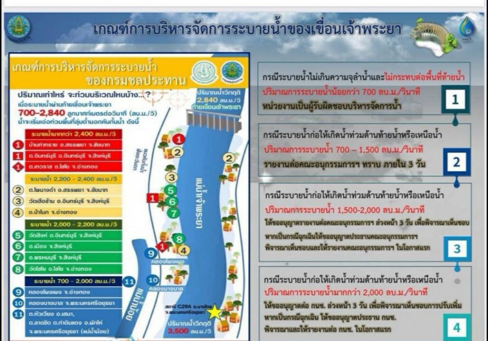 กรมชลประทาน ยืนยันการปล่อยน้ำของเขื่อนเจ้าพระยา ณ ปัจจุบัน คาดว่าจะทำให้ระดับน้ำขึ้นในเกณฑ์ประมาณ 900–1,100 ลบ.ม./ต่อวินาที ส่งผลให้บางพื้นที่ในอำเภอบางบาล เสนา จังหวัดพระนครศรีอยุธยา ระดับน้ำจะเพิ่มสูงขึ้น 0.60–1.00 เมตร ยืนยันจะไม่ส่งผลกระทบต่อพื้นที่ในกรุงเทพฯอย่างแน่นอน
