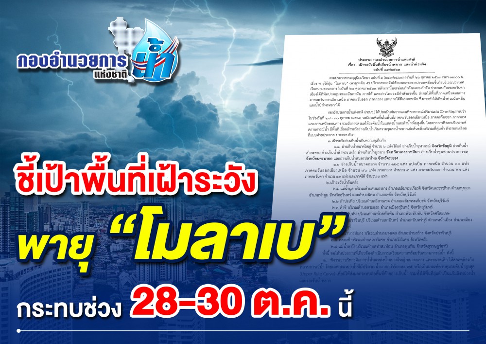 กองอำนวยการน้ำแห่งชาติ (กอนช.) ประกาศเตือนประชาชนเตรียมรับมือ พายุไต้ฝุ่น “โมลาเบ” เข้าไทย ช่วง 28-30 ต.ค.30 หลังได้ประเมินฝนจากแผนที่คาดการณ์ปริมาณฝน (One Map) ทุกภาค เสี่ยงกับน้ำท่วม ระบุ 8 ลำน้ำเออล้นตลิ่ง ขณะที่เขื่อนขนาดใหญ่ 6 แห่งน้ำเต็มแล้ว