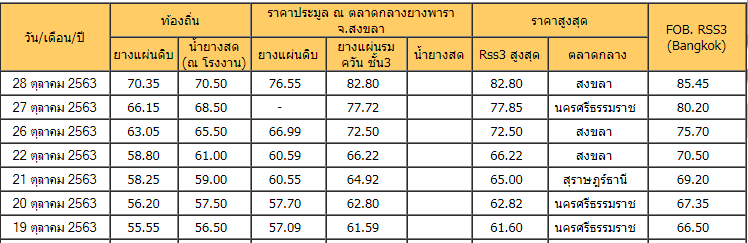 สถาการณ์ราคายางพาราพุ่งไม่หยด ฉุดไม่อยู่ วันนี้ (28 ต.ค.63) ราคากลางเปิดตลาด น้ำยางสดอยู่ที่ กก.ละ 70.50 บาทจากเมื่อวานราคาอยู่ที่ กก.ละ 68.50 บาท น้ำยางก้นถ้วย กก.ละ 47.00 บาท จากเมื่อวาน 46.00 บาท ส่วนยางแผ่นดิบคุณภาพดี กก.ละ 70.18 บาท จากเมื่อวาน 67.33 บาท ขณะที่ยางร่มร่มควันชั้น 3 ราคาประมูล ณ ตลาดยางพารา จ.สงขลาวันที่ี (28 ต.ค.63) แตะที่.ละ 82.80 บาท จากเมือวาน กก. 77.72 บาท