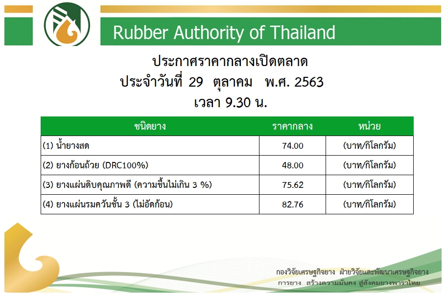 สถาการณ์ราคายางพาราพุ่งขึ้นอย่างต่อเนื่อง วันนี้ (29 ต.ค.63) ราคากลางเปิดตลาด น้ำยางสดอยู่ที่ กก.ละ 74.00 บาทจากเมื่อวานราคาอยู่ที่ กก.ละ 70.50 บาท น้ำยางก้นถ้วย กก.ละ 48.00 บาท จากเมื่อวาน 47.00 บาท ส่วนยางแผ่นดิบคุณภาพดี กก.ละ 75.62 บาท จากเมื่อวาน 70.18 บาท ขณะที่ยางร่มร่มควันชั้น 3 แตะที่.ละ 82.80 บาท จากเมือวาน กก. 77.75 บาท