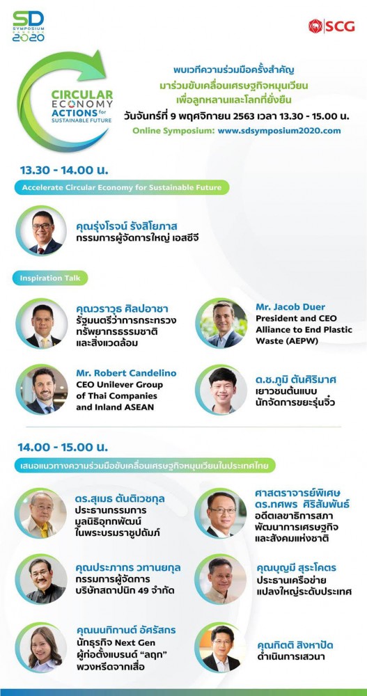 เอสซีจี จัดงานสัมมนาออนไลน์ระดับโลก “SD Symposium 2020” (Sustainable Development Symposium 2020) ภายใต้แนวคิด “Actions for Sustainable Future” ให้ผู้บริหารทั้งภาครัฐและเอกชน ผู้ประกอบการ SMEs นักวิชาการ และคนรุ่นใหม่ที่สนใจ ได้เรียนรู้แลกเปลี่ยนมุมมองกับองค์กรชั้นนำระดับโลก หน่วยงานภาครัฐและภาคประชาสังคมของไทย ตลอดจนชุมชนในท้องถิ่นที่นำแนวคิดเศรษฐกิจหมุนเวียน (Circular Economy) ไปปรับใช้ โดยมีเป้าหมายในการสร้างความตระหนักและร่วมผลักดันให้เกิดการใช้ทรัพยากรอย่างมีประสิทธิภาพสูงสุด ตั้งแต่กระบวนการผลิตจนถึงการบริโภค ซึ่งจะสามารถช่วยสร้างการเติบโตอย่างสมดุลของการดำเนินธุรกิจ การยกระดับคุณภาพชีวิต และอนาคตของโลกที่ยั่งยืน พร้อมสร้างเครือข่ายให้เกิดการพัฒนาอย่างยั่งยืนในภูมิภาคต่อไป