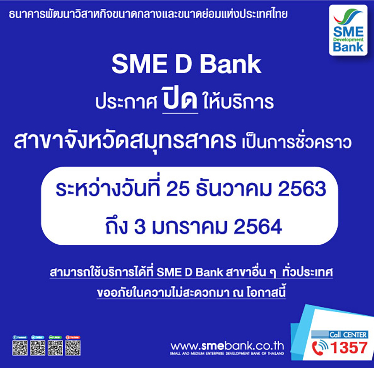 ธนาคารพัฒนาวิสาหกิจขนาดกลางและขนาดย่อมแห่งประเทศไทย (ธพว.) หรือ SME D Bank ห่วงใยสุขภาพความปลอดภัยของลูกค้า และพนักงาน เป็นสำคัญ ได้ดำเนินการตามมาตรฐานด้านสุขอนามัย เพื่อร่วมป้องกันและควบคุมการแพร่ระบาดของโรคโควิด-19 ของกระทรวงสาธารณสุขอย่างเคร่งครัด จึงขอปิดให้บริการ SME D Bank สาขาสมุทรสาคร เป็นการชั่วคราว ตั้งแต่วันที่ 25 ธันวาคม 2563 ถึงวันที่ 3 มกราคม 2564
