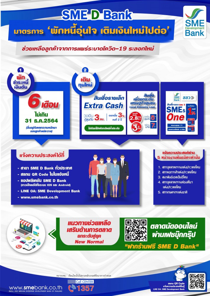 นางสาวนารถนารี รัฐปัตย์ กรรมการผู้จัดการ ธนาคารพัฒนาวิสาหกิจขนาดกลางและขนาดย่อมแห่งประเทศไทย (ธพว.) หรือ SME D Bank เปิดเผยว่า จากสถานการณ์การแพร่ระบาดของโรคโควิด-19 ระลอกใหม่ ภายในประเทศไทย ส่งผลกระทบต่อการดำเนินธุรกิจของผู้ประกอบการเอสเอ็มอี ทั้งทางตรงและทางอ้อม เช่น ยอดขายลดลง ชะลอยอดสั่งซื้อ จำนวนผู้ใช้บริการลดลง เป็นต้น SME D Bank ในฐานะสถาบันการเงินของรัฐ พร้อมเคียงข้างดูแลลูกค้าธนาคาร และผู้ประกอบการเอสเอ็มอี จึงออกชุดมาตรการ “พักหนี้อุ่นใจ เติมเงินใหม่ไปต่อ” โดยแนวทางช่วยเหลือขึ้นอยู่กับผลกระทบหนักเบาของลูกค้าแต่ละราย เป้าหมายเพื่อช่วยประคับประคองธุรกิจของผู้ประกอบการเอสเอ็มอีให้เดินต่อไปได้ จนกว่าสถานการณ์จะกลับคืนสู่ภาวะปกติ