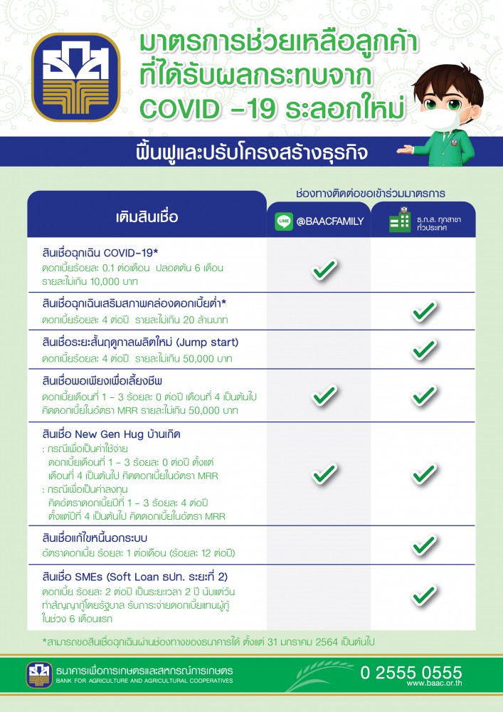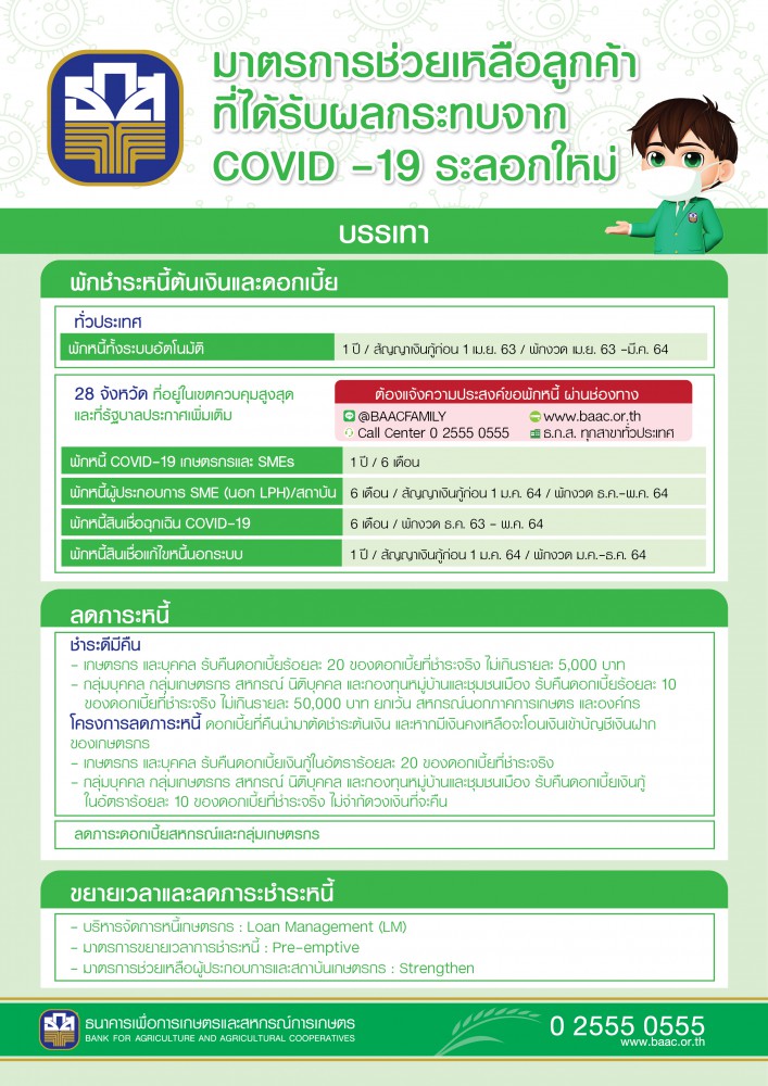 ธ.ก.ส. ออกมาตรการช่วยเกษตรกรรับมือปัญหาการแพร่ระบาดโควิด-19 ระลอกใหม่โดยพักชำระหนี้ 6 เดือน-1 ปี ให้กับเกษตรกร กลุ่มบุคคล กองทุนหมู่บ้านหรือชุมชน ผู้ประกอบการ (นิติบุคคล) องค์กร กลุ่มเกษตรกรและสหกรณ์ (ไม่รวมสหกรณ์ออมทรัพย์ข้าราชการ รัฐวิสาหกิจ) ที่ได้รับผลกระทบและอยู่ในพื้นที่ 28 จังหวัดที่อยู่ในเขตควบคุมสูงสุดและที่ภาครัฐจะประกาศเพิ่มพร้อมขยายเวลาเปิดรับคำขอสินเชื่อฉุกเฉิน รายละไม่เกิน10,000 บาท และสินเชื่อดอกเบี้ยต่ำเพื่อฟื้นฟูและปรับโครงสร้างธุรกิจติดตามรายละเอียดได้ที่ www.baac.or.th