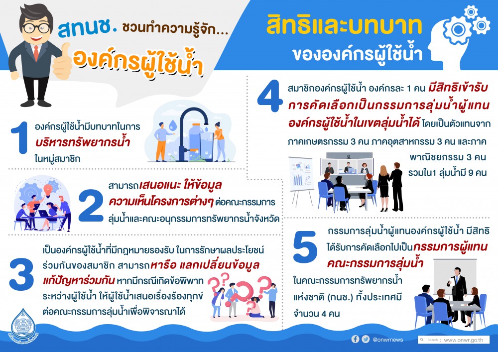 “การจัดตั้งองค์กรผู้ใช้น้ำ ถือเป็นมิติใหม่ของการสร้างเครือข่ายความร่วมมือทั้งในระดับพื้นที่ เพื่อให้ผู้ใช้น้ำ หน่วยงานภาครัฐ องค์กรปกครองส่วนท้องถิ่นและทุกภาคส่วน ได้มีส่วนร่วมในการบริหารจัดการทรัพยากรน้ำในพื้นที่ของตนเอง ส่วนความร่วมมือในระดับลุ่มน้ำก็สามารถนำความคิดเห็นที่เกิดขึ้นในพื้นที่ สะท้อนผ่านคณะกรรมการลุ่มน้ำไปยังองค์กรระดับชาติ เพื่อนำกลับมาใช้ในการบริหารจัดการทรัพยากรน้ำในพื้นที่ได้เช่นกัน” เลขาธิการ สทนช. กล่าว
