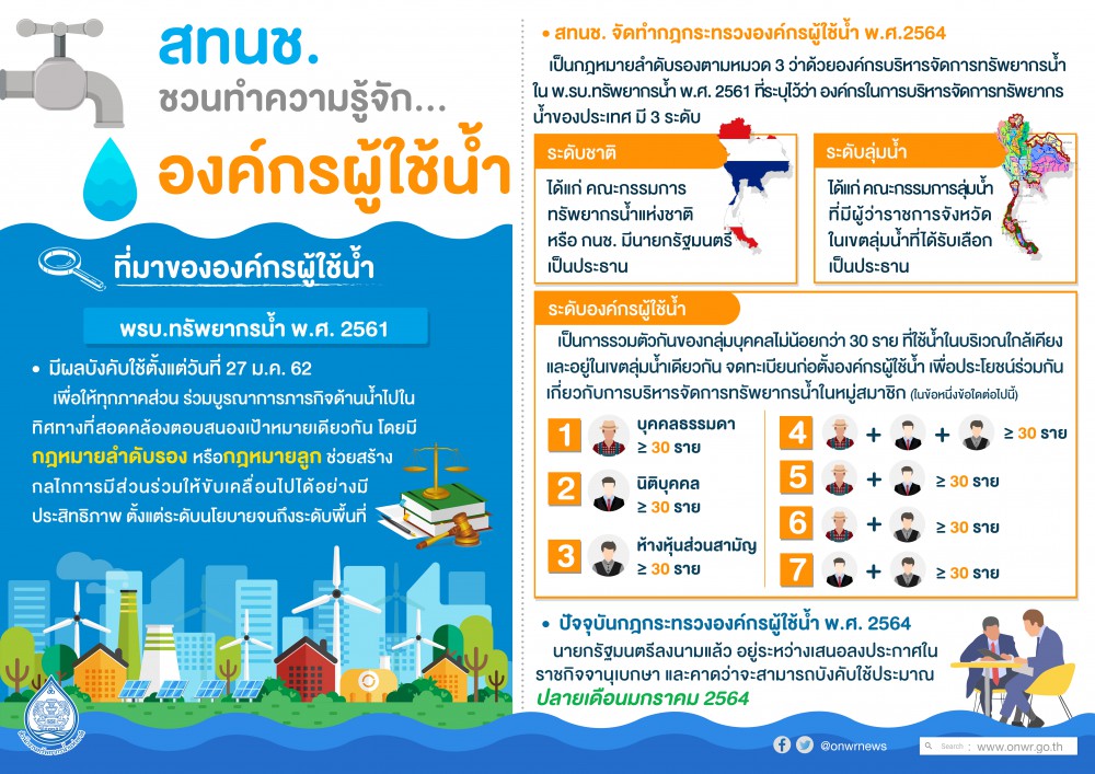 สทนช.เตรียมความพร้อมจดทะเบียนองค์กรผู้ใช้น้ำ ยกระดับการมีส่วนร่วมบริหารจัดการทรัพยากรน้ำของประเทศ ตาม พ.ร.บ.ทรัพยากรน้ำ พ.ศ. 2561 หลังจากที่นายกรัฐมนตรี ได้ลงนามในกฎกระทรวงองค์กรผู้ใช้น้ำ พ.ศ. 2564 เรียบร้อยแล้ว รอเพียงลงประกาศในราชกิจจานุเบกษาเท่านั้น