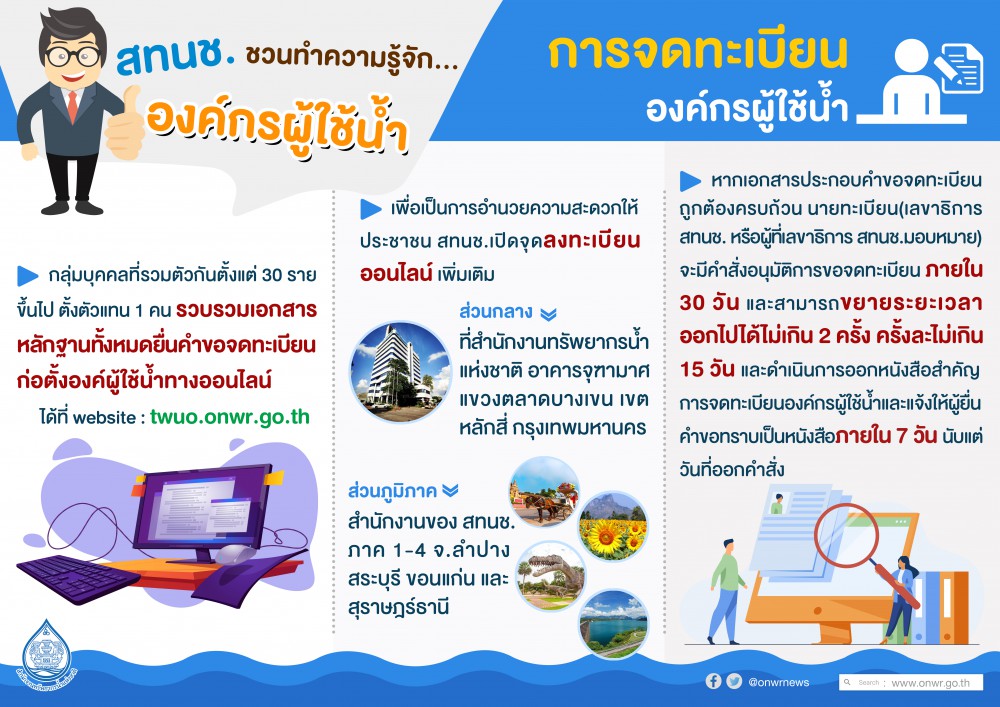 1.บุคคลธรรมดา 2.นิติบุคคล 3.ห้างหุ้นส่วนสามัญ ที่เป็นผู้ใช้น้ำบริเวณใกล้เคียงกันและอยู่ในเขตลุ่มน้ำเดียวกัน รวมตัวกันจดทะเบียนก่อตั้งองค์กรผู้ใช้น้ำ แต่ต้องมีจำนวนไม่น้อยกว่า 30 ราย และตั้งตัวแทน 1 คนทำหน้าที่รวบรวมเอกสารหลักฐานจดทะเบียนก่อตั้งองค์กรผู้ใช้น้ำทางออนไลน์ทาง Website : twuo.onwr.go.th อย่างไรก็ตาม เพื่อเป็นการอำนวยความสะดวกให้ประชาชน สทนช. เปิดจุดลงทะเบียนออนไลน์เพิ่มเติม ส่วนกลางที่สำนักงานทรัพยากรน้ำแห่งชาติ อาคารจุฑามาศ เขตหลักสี่ กรุงเทพ ส่วนภูมิภาคที่สำนักงานของ สทนช. ภาค 1-4 จังหวัดลำปาง สระบุรี ขอนแก่น และสุราษฎร์ธานี