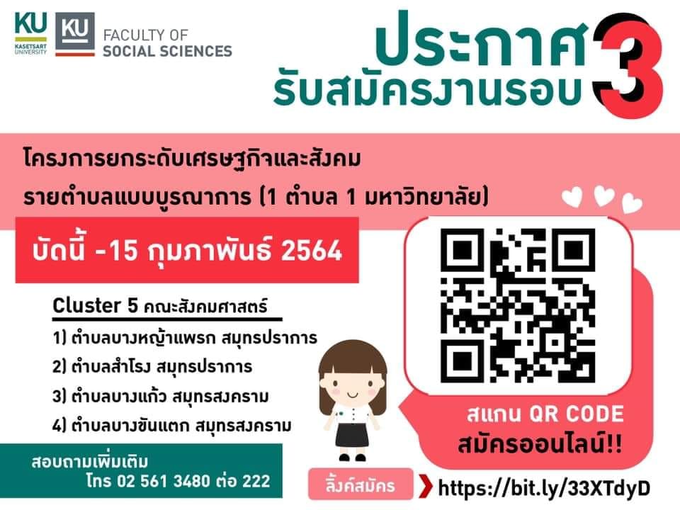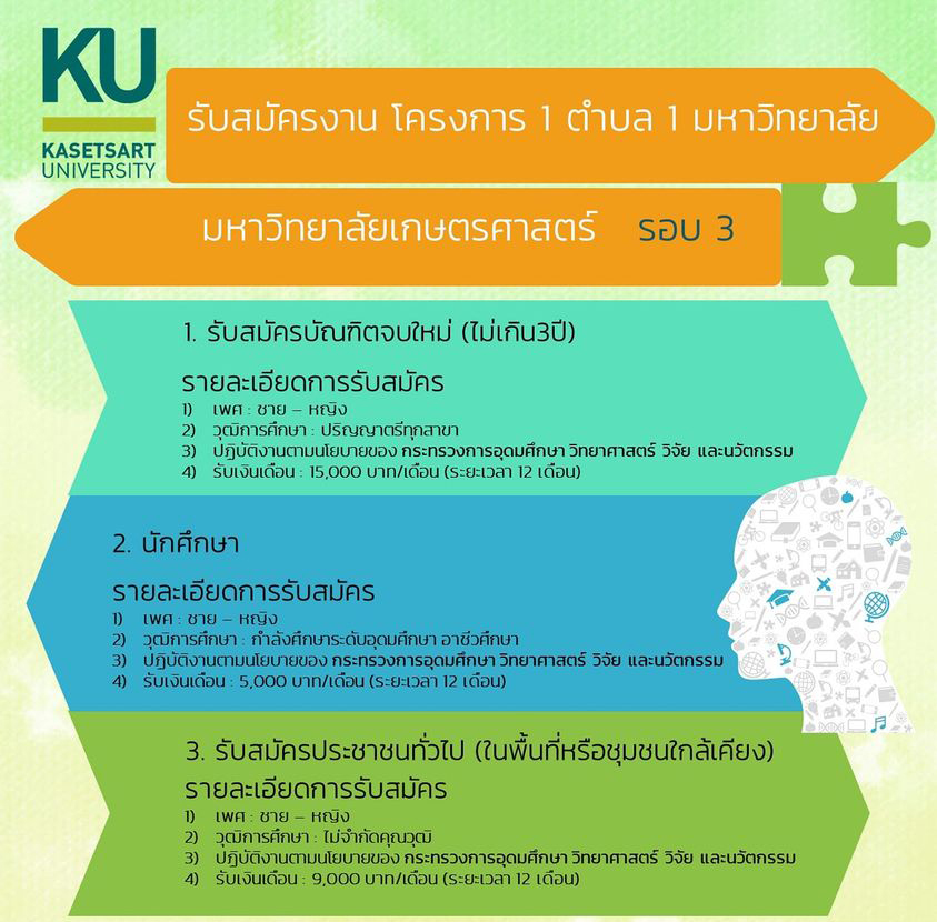 มหาวิทยาลัยเกษตรศาสตร์ เปิดรับสมัครบัณฑิตที่จบใหม่ไม่เกิน 3 ปี หรือนิสิต นักศึกษาผู้ที่กำลังศึกษา และประชาชนในพื้นที่และบริเวณใกล้เคียง เข้าร่วมโครงการ 1 ตำบล 1 มหาวิทยาลัย รอบ 3 สนใจสมัครได้ตั้งแต่