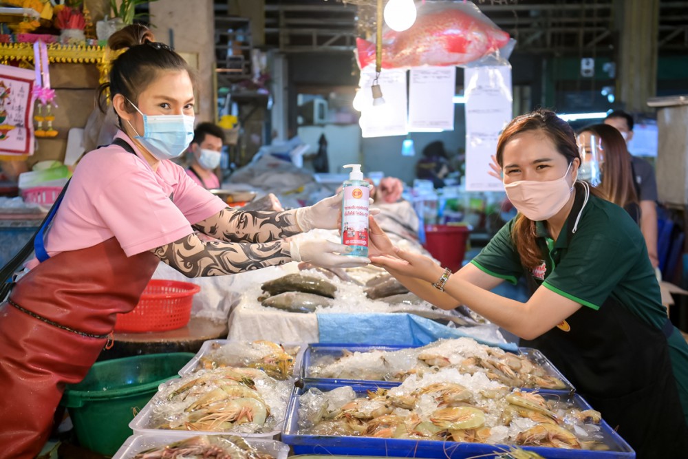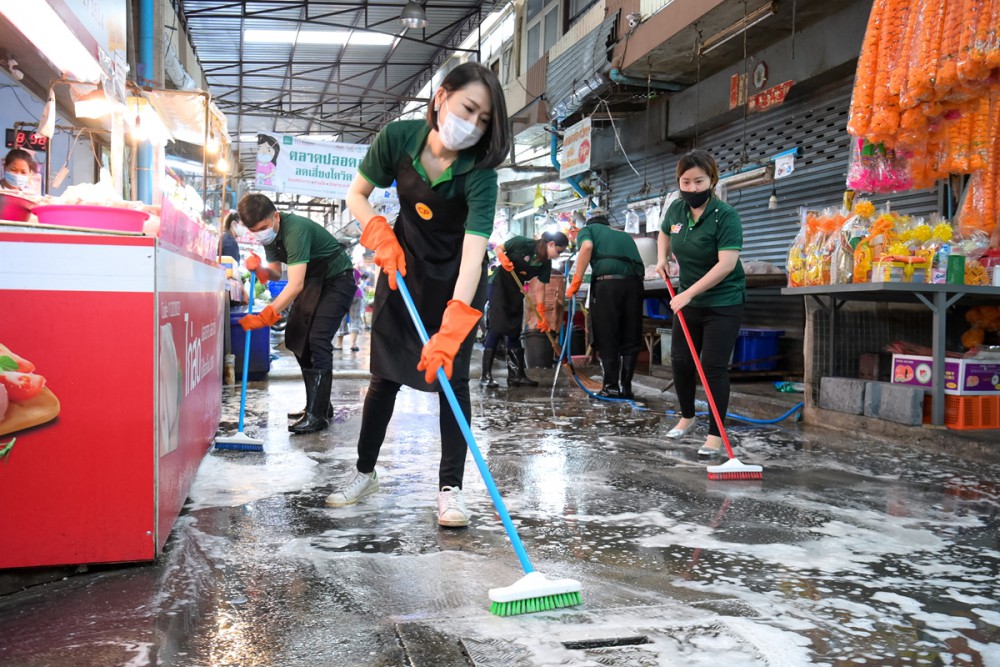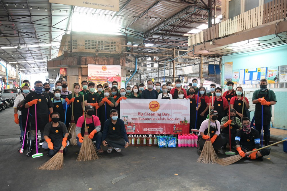 นางสาวดรุณรัตน์ อภิเกษมสันติ์ ผู้จัดการทั่วไปฝ่ายการตลาด บริษัท เจริญโภคภัณฑ์อาหาร จำกัด (มหาชน) หรือ ซีพีเอฟ พร้อมด้วย นางสาวพจมาน ธรรมสโรช ผู้จัดการกลุ่มลูกค้าธุรกิจระดับภูมิภาค กรุงเทพตอนเหนือ และ จ.นนทบุรี นำทีม ซีพี เฟรชมาร์ท เขตบางซื่อ ผนึกกำลัง ทรู ร่วมกับ นายทรงวุฒิ ทองจรัส เจ้าของตลาดเตาปูน และชุมชนบางซื่อ จัด Big Cleaning Day ในโครงการ “ยกระดับสุขอนามัย มั่นใจไร้โควิด-19” สนับสนุนน้ำยาฆ่าเชื้อ อุปกรณ์ทำความสะอาด และแจกผลิตภัณฑ์เจลแอลกอฮอล์ให้กับพ่อค้าแม่ค้า เพื่อสร้างความมั่นใจให้กับผู้บริโภคที่มาใช้บริการ ตลาดสดปลอดภัย ตอกย้ำมาตรการเฝ้าระวังการแพร่ระบาดเชื้อโควิด-19