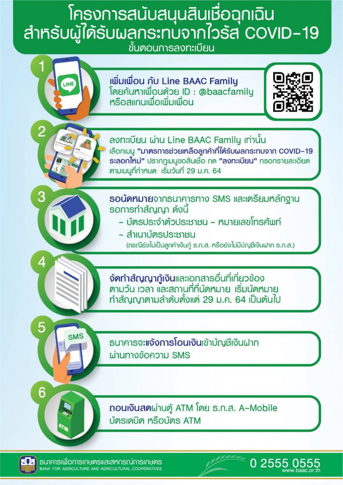 ทั้งนี้ สามารถแจ้งความจำนงค์เข้าร่วมโครงการข้างต้นกับ ธ.ก.ส. ผ่านช่องทาง LINE Official BAAC Familyเว็บไซต์ www.baac.or.thโดยในกรณีแสดงความประสงค์ขอพักชำระหนี้จะปรากฏข้อความ “ธ.ก.ส. ได้รับข้อมูลของท่านเรียบร้อยแล้ว” เป็นการดำเนินการเสร็จสิ้น หากลูกค้าแสดงความประสงค์ขอสินเชื่อ ให้เลือกประเภทสินเชื่อที่ต้องการและกด “ถัดไป” จะปรากฏข้อความ “ธ.ก.ส. ได้รับข้อมูลของท่านเรียบร้อย” เป็นการดำเนินการเสร็จสิ้นและช่องทาง Call Center 02 555 0555 หรือที่ สาขา ธ.ก.ส. ในพื้นที่