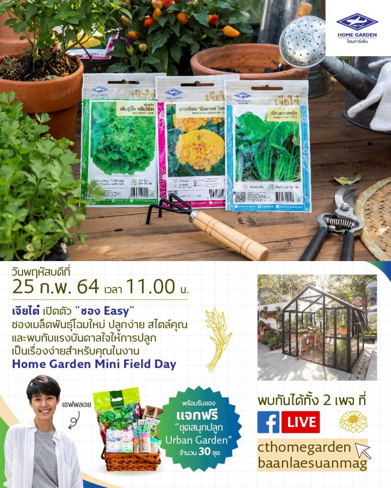 บริษัท เจียไต๋ จำกัด ผู้นำธุรกิจนวัตกรรมการเกษตรของไทย ขอเชิญรับชมกิจกรรมเปิดตัวซองเมล็ดพันธุ์เจียไต๋ โฮมการ์เด้นโฉมใหม่ ที่พัฒนาขึ้นเพื่อตอบสนองความต้องการของลูกค้าอย่างครบครัน พร้อมเปิดสวนหน้าอาคารสำนักงานใหญ่ สุขุมวิท 60 ซึ่งรังสรรค์ขึ้นเป็น Urban Garden Space พื้นที่สร้างแรงบันดาลใจให้คนเมืองหันมาปลูกผักเพื่อรับประทานเองภายใต้แนวคิด “ปลูกง่าย สไตล์คุณ” ในกิจกรรมเปิดตัวรูปแบบออนไลน์ “Home Garden Mini Field Day”