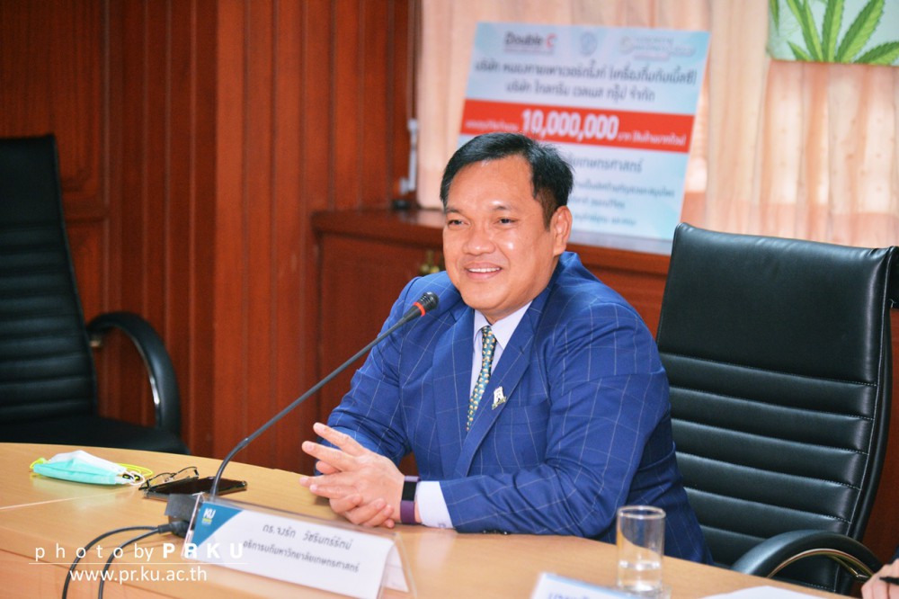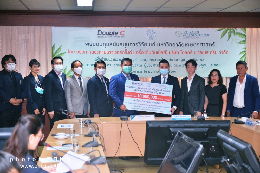 ดร.จงรัก วัชรินทร์รัตน์ อธิการบดีมหาวิทยาลัยเกษตรศาสตร์ เป็นประธานในพิธีรับมอบทุนสนับสนุนการวิจัย เพื่อปรับปรุงสายพันธุ์กัญชงที่เหมาะสมสำหรับประเทศไทย สามารถให้ดอกที่มีปริมาณสาร Cannabinoid : CBD สูงสุด และเพื่อร่วมสนับสนุนโครงการจัดตั้งศูนย์ความเป็นเลิศกัญชงและสมุนไพร ของมหาวิทยาลัยเกษตรศาสตร์ วิทยาเขตกำแพงแสน จังหวัดนครปฐม จากนายชนินทร์ เฮ้งเจริญสุข กรรมการผู้จัดการบริษัท หนองคายเพาเวอร์ดริ๊งก์ (เครื่องดื่มดับเบิ้ลซี) จำกัด บริษัท โกลกรีน เวลเนส กรุ๊ป จำนวน 10 ล้านบาท เมื่อวันที่ 16 มีนาคม 2564 ที่อาคารสารนิเทศ 50 ปี มหาวิทยาลัยเกษตรศาสตร์ โดยมี ผศ.ดร.นิคม แหลมสัก รองอธิการบดีฝ่ายนวัตกรรมและกิจการเพื่อสังคม รศ.ดร.วีรชัย พุทธวงศ์ ผู้ช่วยอธิการบดีฝ่ายนวัตกรรมและกิจการเพื่อสังคม เข้าร่วมในพิธีรับมอบด้วย