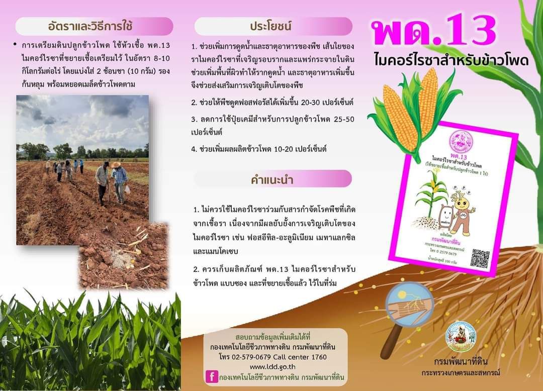 กรมพัฒนาที่ดิน ชูผลิตภัณฑ์ใหม่ “พด.13” นวัตกรรมไมคอร์ไรซาสำหรับข้าวโพด เผยผลจากการใช้แล้ว ทำให้ลดการใช้ปุ๋ยเคมีได้ ร้อยละ 20 – 50 ข้าวโพดสามารถดูดซับฟอสฟอรัสได้เพิ่มขึ้นร้อยละ 20 – 30 ขณะที่ผลผลิตเพิ่มขึ้น 10 – 20 %