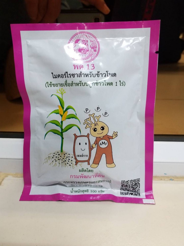 ในปี 2563 จึงนำมาพัฒนาเป็นผลิตภัณฑ์จุลินทรีย์ชนิดใหม่ ใช้ชื่อว่า “พด.13 ไมคอร์ไรซาสำหรับข้าวโพด” ซึ่งประกอบด้วย ราอาร์บัสคูลาร์ไมคอร์ไรซา 2 สายพันธุ์ (Glomus sp. และ Acaulospora sp. ช่วยส่งเสริมการเจริญเติบโตของข้าวโพด) และแบคทีเรีย 2 สายพันธุ์ (แบคทีเรียตรึงไนโตรเจนแบบอิสระ Azotobacter chroococcum และแบคทีเรีย ผลิตฮอร์โมนพืช Bacillus sp. ช่วยให้ไมคอร์ไรซาเข้าอยู่อาศัยในรากได้เพิ่มขึ้น)