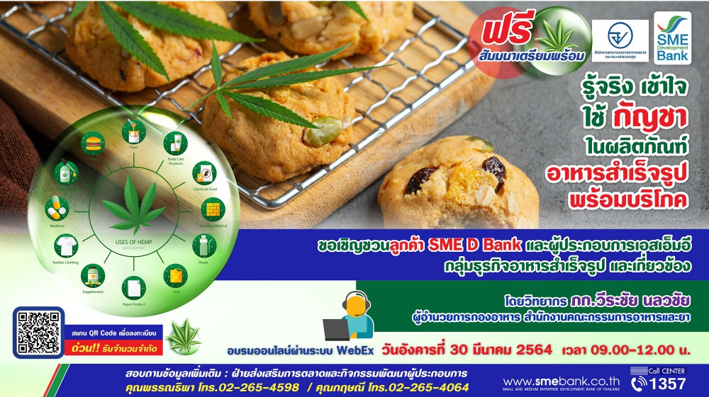 ธนาคารพัฒนาวิสาหกิจขนาดกลางและขนาดย่อมแห่งประเทศไทย (ธพว.) หรือ SME D Bank ร่วมกับ สำนักงานคณะกรรมการอาหารและยา (อย.) กระทรวงสาธารณสุข เชิญชวนลูกค้า SME D Bank และผู้ประกอบการเอสเอ็มอีกลุ่มธุรกิจอาหารสำเร็จรูป และเกี่ยวข้อง ร่วมสัมมนาออนไลน์ หัวข้อ “รู้จริง เข้าใจ ใช้กัญชา ในผลิตภัณฑ์อาหารสำเร็จรูปพร้อมบริโภค”