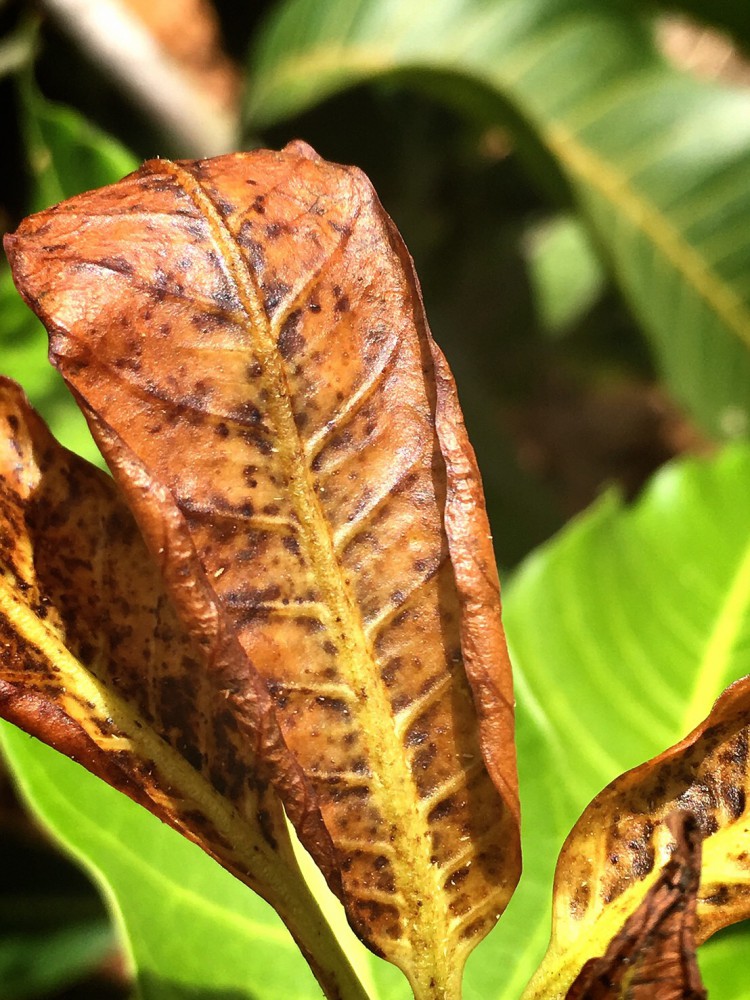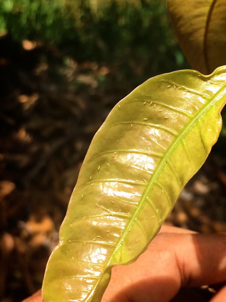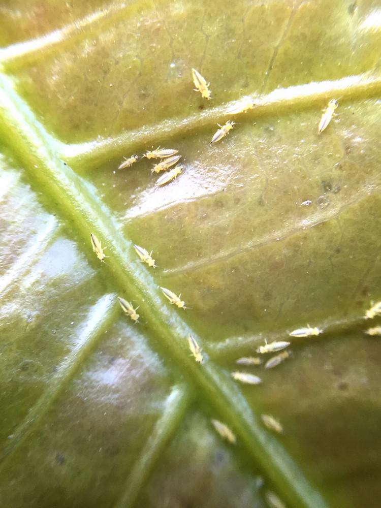 กรณีการเข้าทำลายในระยะติดดอก จะทำให้ช่อดอกหงิกงอ ดอกร่วงไม่ติดผล หรือทำให้ติดผลน้อย การเข้าทำลายบนยอดอ่อน จะทำให้ใบที่แตกใหม่แคระแกร็น ขอบใบและปลายใบไหม้ ใบอาจร่วงตั้งแต่ยังเล็ก สำหรับใบที่มีขนาดโตแล้ว มักพบการเข้าทำลายตามขอบใบ ทำให้ใบม้วนงอและปลายใบไหม้ การเข้าทำลายที่ยอด จะมีความรุนแรงจนทำให้ยอดแห้ง ไม่แทงช่อใบหรือช่อดอก การเข้าทำลายที่ตา ช่อดอกจะบิดเบี้ยว หงิกงอ หรือติดผลน้อย ผลเล็กที่ถูกเพลี้ยไฟทำลายอาจร่วงหล่นได้