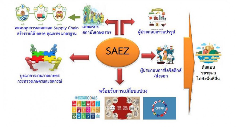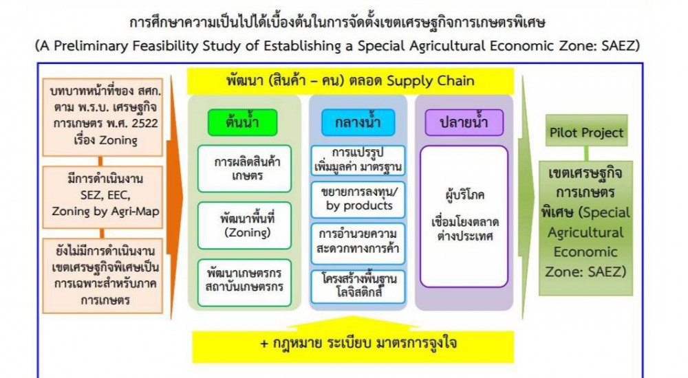 ด้วยเหตุนี้ ดร.เฉลิมชัย ศรีอ่อน รัฐมนตรีว่าการกระทรวงเกษตรและสหกรณ์ จึงได้มอบหมายให้ สศก. ศึกษาความเป็นไปได้เบื้องต้นในการจัดตั้งเขตเศรษฐกิจการเกษตรพิเศษ โดย สศก. ได้เสนอโครงการศึกษาวิจัย “การศึกษาความเป็นไปได้เบื้องต้นในการจัดตั้งเขตเศรษฐกิจการเกษตรพิเศษ” (Special Agricultural Economic Zone: SAEZ) ซึ่งจะเน้นการพัฒนา ในเชิงพื้นที่ ทำให้สามารถลงลึกในรายละเอียดได้รวดเร็วกว่าการดำเนินงานปกติหรือการพัฒนาในเชิงภาพรวม นำไปสู่การให้ข้อเสนอแนะเชิงนโยบายเพื่อการจัดตั้งเขตเศรษฐกิจการเกษตรพิเศษ และเกิดการขับเคลื่อนไปสู่การปฏิบัติอย่างเป็นรูปธรรม โดย สศก. จะดำเนินการศึกษาวิจัยร่วมกับทางมหาวิทยาลัยหอการค้าไทย รวมไปถึงการขอรับสนับสนุนทุนวิจัยจากสำนักงานพัฒนาการวิจัยการเกษตร (องค์การมหาชน) (สวก.) ที่เป็นหน่วยงานเครือข่ายความร่วมมือทางวิชาการและการต่อยอดงานวิจัยร่วมกัน