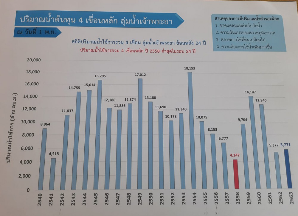 หากย้อนดูข้อมูลในรอบ 40 ปีที่ผ่านมา พบว่าในปีนี้ประเทศไทยประสบปัญหาภัยแล้งหนักสุดอีกปีหนึ่ง เนื่องเกิดจากปริมาณน้ำมีน้อยต่อเนื่องกันมาติดต่อกัน 2 ปี ตั้งแต่ปี พ.ศ. 2562 และ ปี 2563 โดยเฉพาะในปี 2563 ถือว่ามีความแห้งแล้งในรอบ 40 ปี ที่รองจากปี 2522 และต่อเนื่องมาปี 2564 ทั้งในภาคอีสาน ภาคเหนือ แม้แต่ภาคกลางโดยเฉพาะในเขตชลประทานตามลุ่มเจ้าพระยาปริมาณมีน้ำน้อยมาก