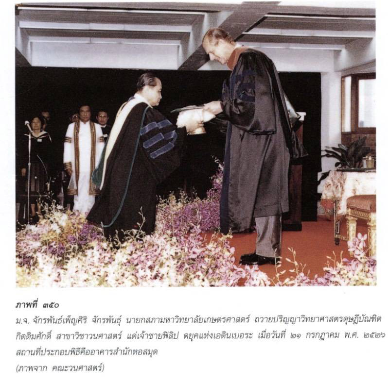 การถวายพระเกียรติคุณ ทูลเกล้า ฯ ถวายปริญญาวิทยาศาสตรดุษฎีบัณฑิตกิตติมศักดิ์ สาขาวิชาวนศาสตร์ แด่เจ้าชายฟิลิป ดยุคแห่งเอดินเบอระ ของมหาวิทยาลัยเกษตรศาสตร์ในครั้งนั้น เนื่องมาจาก เจ้าชายฟิลิป ดยุคแห่งเอดินเบอระองค์ประธานกองทุนสัตว์ป่าโลก World Wildlife Fund ทรงสนพระทัยอย่างยิ่งในกิจกรรมอนุรักษ์ป่าทั่วโลกมาเป็นเวลาอันยาวนาน