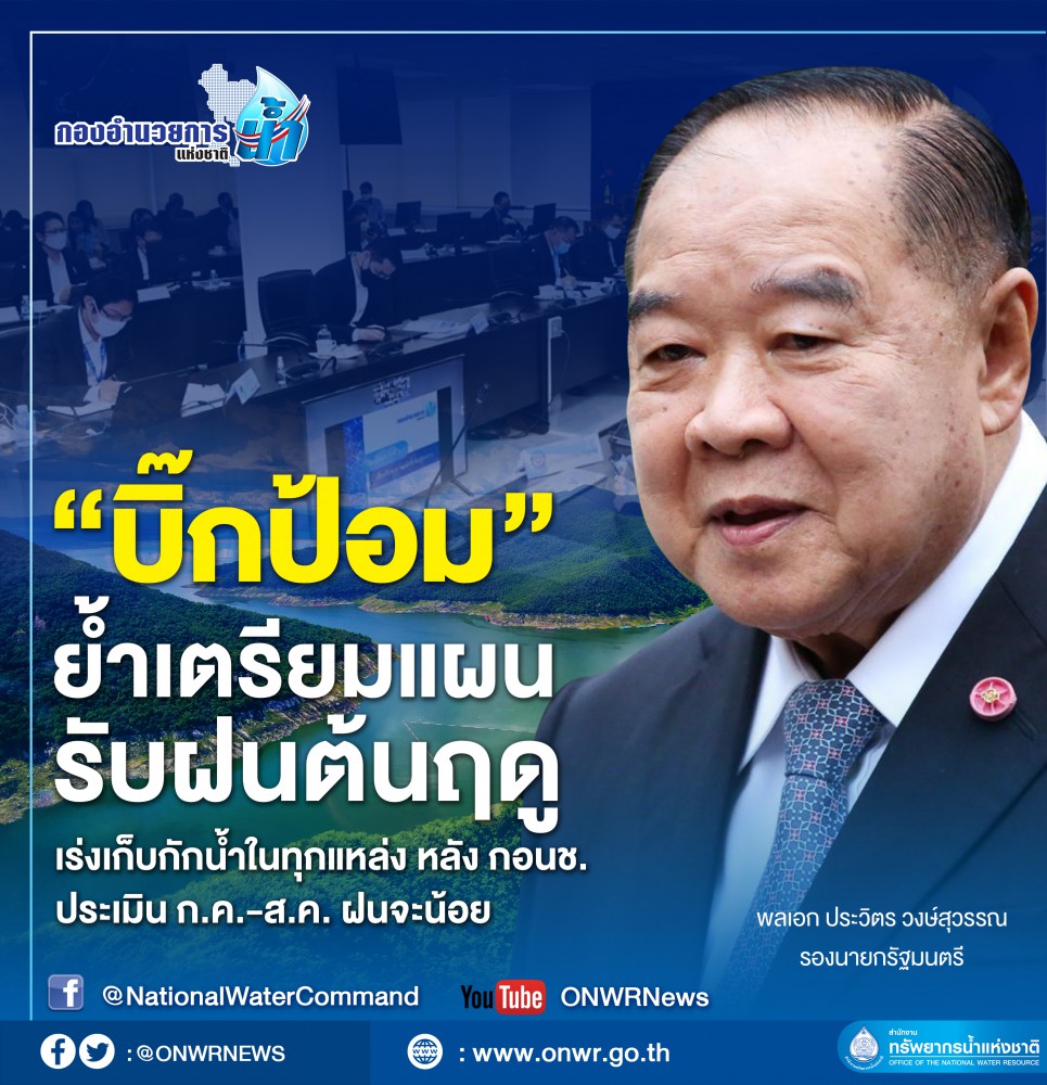 “ประวิตร” สั่งการ สทนช.ประสานหน่วยงานและท้องถิ่น เร่งสำรวจความพร้อมทุกแหล่งเก็บน้ำ พร้อมรองรับน้ำฝนช่วงตกชุก เม.ย.- มิ.ย.นี้ เพื่อสำรองน้ำไว้ใช้ หลัง กอนช.ประเมินมีแนวโน้มฝนลดลงในช่วงเดือน ก.ค.-ส.ค.64 เผยอนิสงค์จากพายุฤดูร้อนช่วงเดือนเมษายน ส่งผลให้มีน้ำไหลเข้าแหล่งน้ำขนาดใหญ่กว่า 500 ล้านลูกบาศก์เมตร ขณะที่ล่าสุดอ่างเก็บน้ำขนาดใหญ่ และขนาดกลางที่มีปริมาณน้ำใช้การน้อยกว่าร้อยละ 30 ถึง 100 แห่ง