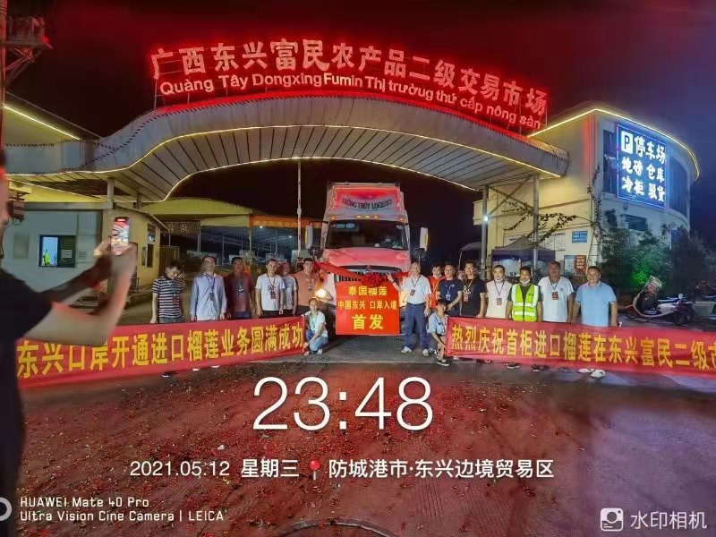 ปรากฏว่า รถขนส่งสามารถผ่านเข้าด่านตงซิงและผ่านพิธีการศุลกากรได้อย่างราบรื่น โดยผู้ประกอบการจีนได้ทำการต้อนรับตู้ทุเรียนตู้แรกของไทย ณ ตลาดการค้าสินค้าเกษตรฟู่หมินตงซิงกว่างซี เมื่อเวลา 23.48 น. ตามเวลาท้องถิ่น ของวันที่ 12 พฤษภาคม 2564 ซึ่งเป็นผลจากการที่สำนักงานศุลกากรแห่งชาติจีน (GACC) ได้ประกาศให้ด่านตงซิง (สะพานข้ามแม่น้ำเป่ยหลุนแห่งที่ 2) สามารถนำเข้าผลไม้จากต่างประเทศได้ ตั้งแต่วันที่ 29 เมษายน 2564