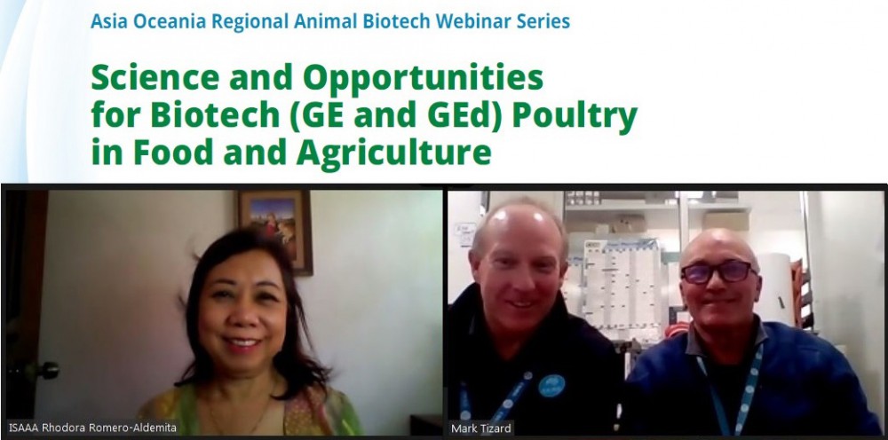 ISAAA ได้เปิดการสัมมนาทางเว็บเป็นครั้งแรกของซีรีส์การสัมมนาทางเว็บไซต์เกี่ยวกับเทคโนโลยีชีวภาพด้านสัตว์ระดับภูมิภาคเอเชีย-โอเชียเนีย โดยมุ่งเน้นไปที่การแก้ไขยีนในสัตว์ปีก (ไก่) การสัมมนาทางเว็บฯครั้งนี้เป็นการนำเสนอการแก้ไขยีนโดยใช้ CRISPR เพื่อพัฒนาพันธุ์ไก่ที่มีลักษณะพิเศษซึ่งจะนำไปสู่การพัฒนาการเลี้ยงไก่เนื้อและไก่ไข่ รวมถึงการผลิตสารชีวภาพทางการแพทย์