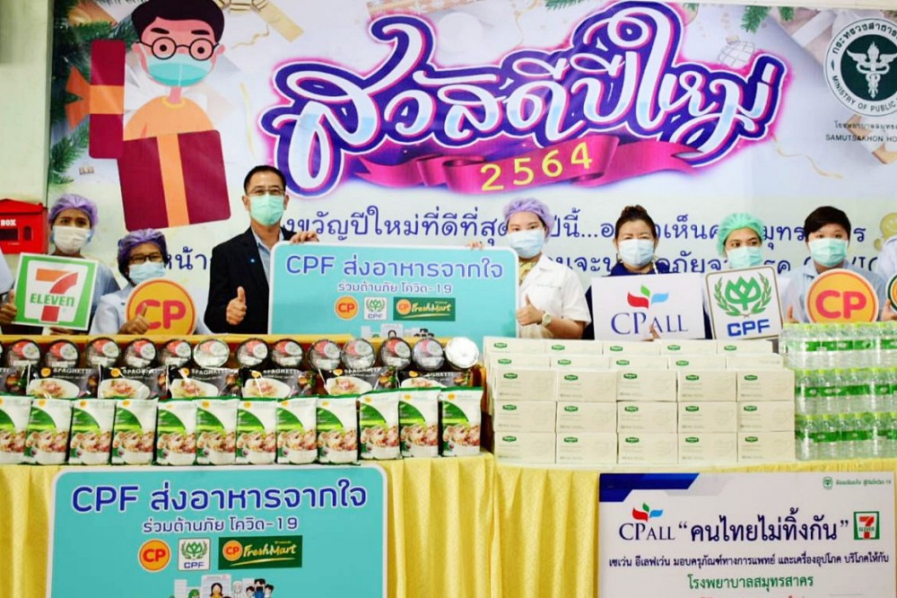 นอกจากนี้ ที่จังหวัดสมุทรสาคร นายสุวิทย์ ประภากมล ผู้บริหารอาวุโส ซีพีเอฟ นำทีมซีพีเอฟจิตอาสา ร่วมมอบผลิตภัณฑ์อาหาร พร้อมกับทีมงานจิตอาสาจาก เซเว่น อีเลฟเว่น ที่นำครุภัณฑ์ทางการแพทย์ แอลกอฮอลล์ทำความสะอาด หน้ากากอนามัย และน้ำดื่ม มอบให้กับ นางสาวรัตติกรณ์ กาญจนะ พยาบาลวิชาชีพชำนาญการ กลุ่มการพยาบาล โรงพยาบาลสมุทรสาคร และ นางสาวชนันท์ภัทร์ สุขประเสริฐ พยาบาลวิชาชีพ โรงพยาบาลบ้านแพ้ว จ.สมุทรสาคร เป็นตัวแทนโรงพยาบาล รับมอบ เพื่อนำไปสนับสนุนการปฎิบัติงานของเจ้าหน้าที่ บุคลากรทางการแพทย์ และประชาชนในพื้นที่ต่อไป