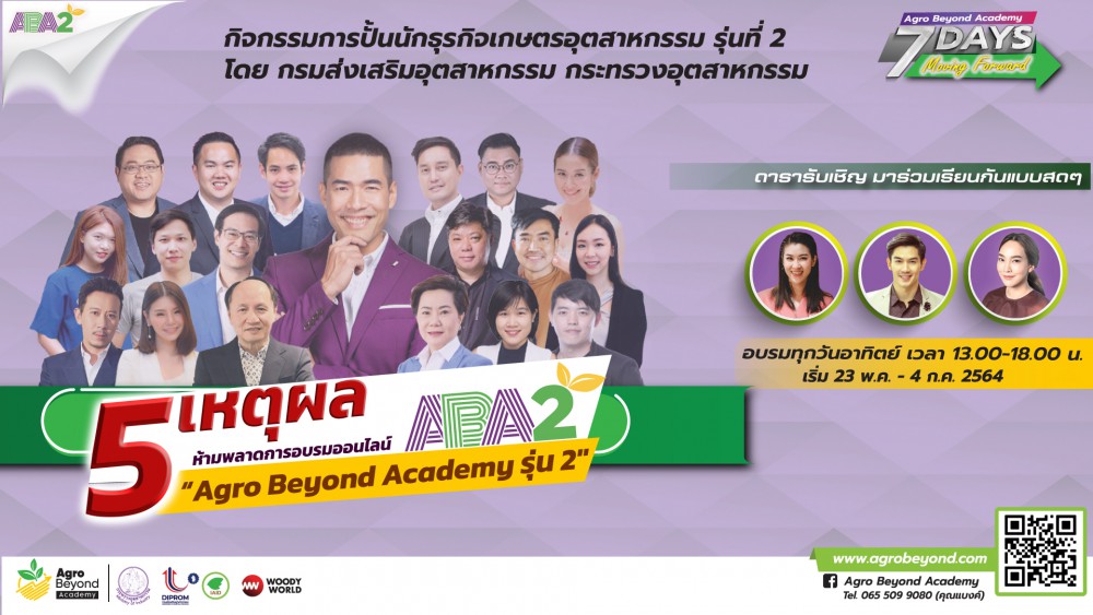 อีกครั้งที่กรมส่งเสริมอุตสาหกรรม (กสอ.) กระทรวงอุตสาหกรรม ร่วมกับบริษัท วู้ดดี้เวิลด์ จำกัด ได้จัดอบรมออนไลน์ “Agro Beyond Academy รุ่นที่ 2” ในระหว่างเดือน พฤษภาคม – กรกฎาคม 2564 ซึ่งเป็นเป็นการต่อยอดและขยายโอกาส เพื่อเพิ่มทักษะนักธุรกิจเกษตรอุตสาหกรรมและเกษตรเชิงอุตสาหกรรมทั่วประเทศ ทั้งนี้เป็นการตอกย้ำความสำเร็จในโครงการครั้งที่ผ่านมา อีกทั้งเพื่อสร้างมูลค่าทางเศรษฐกิจเพื่อความเข้มแข็งให้เศรษฐกิจไทยอีกต่อไป