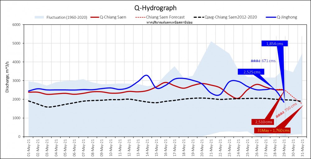 อย่างไรก็ตาม กองอำนวยการน้ำแห่งชาติ ได้ประเมินระดับน้ำในแม่น้ำโขงเนื่องจากการลดการระบายน้ำของเขื่อนจิ่งหง จึงออกประกาศแจ้งเตือนผลกระทบที่จะเกิดขึ้น ดังนี้ 1. ช่วงเหนือเขื่อนไซยะบุรี สาธารณรัฐประชาธิปไตยประชาชนลาว บริเวณสถานีเชียงแสน อำเภอเชียงแสน จังหวัดเชียงราย คาดการณ์ระดับน้ำลดลง 80 – 100 เซนติเมตร ในช่วงวันที่ 31 พฤษภาคม – 2 มิถุนายน 2564