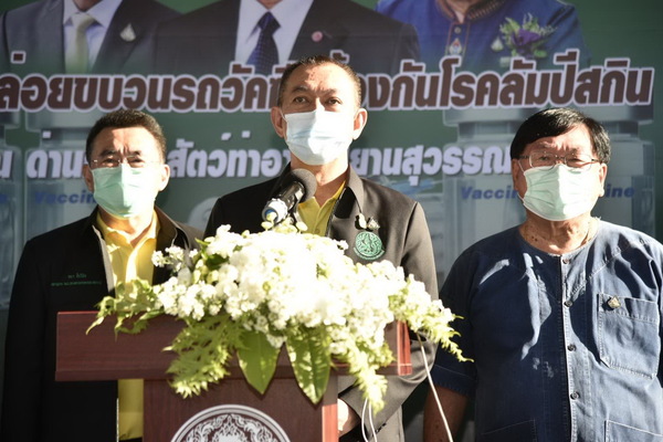 เมื่อเวลา 16.30 น.วันที่ 30 พฤษภาคม 2564 ดร.เฉลิมชัย ศรีอ่อน รัฐมนตรีว่ากระทรวงเกษตรและสหกรณ์ เป็นประธานในพิธีส่งมอบวัคซีน เพื่อช่วยเหลือเกษตรกรผู้ได้รับผลกระทบจากโรคลัมปี สกิน พร้อมด้วยนายประภัตร โพธสุธน รัฐมนตรีช่วยว่าการกระทรวงเกษตรและสหกรณ์ และผู้บริหารกระทรวงเกษตรและสหกรณ์ ณ ด่านกักกันสัตว์ท่าอากาศยานสุวรรณภูมิ และในโอกาสนี้ได้ปล่อยขบวนรถขนส่งวัคซีนลัมปี สกิล และทีมสัตวแพทย์ออกปฏิบัติงานฉีดวัคซีนป้องกันโรคดังกล่าว ให้กับเกษตรกรในพื้นที่ที่ได้รับผลกระทบ