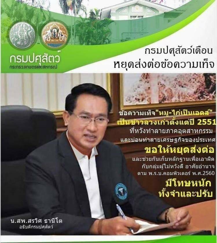 จากกรณีที่มีการส่งต่อข่าวปลอม “หมูไก่ติดเชื้อตัวใหม่ เป็นเอดส์ ห้ามกิน 6 เดือน” ซึ่งเป็นข้อความเท็จที่ถูกสร้างขึ้นและนำเข้าระบบคอมพิวเตอร์ ตั้งแต่ปี 2551 และนำมาแชร์กันอีกครั้งในช่วงนี้นั้น ล่าสุด นายสัตวแพทย์สรวิศ ธานีโต อธิบดีกรมปศุสัตว์ ยืนยันว่า เป็นเรื่องที่ไม่เป็นความจริง ข่าวปลอมนี้ถูกดัดแปลงเสริมแต่งข้อความ และนำมาวนแชร์ต่อๆกันทุกปี ซึ่งเกิดจากผู้ไม่หวังดี คิดทำลายภาคอุตสาหกรรม และซ้ำเติมพี่น้องเกษตรกรในวิกฤตโควิดเช่นนี้ อาศัยช่วงเวลาที่ทุกคนต่างกังวลต่อสุขภาพและระมัดระวังเรื่องการบริโภค มาสร้างข่าวปลอมเพื่อให้ประชาชนวิตกกังวลยิ่งขึ้น ถือว่ามีความผิดตาม พ.ร.บ.คอมพิวเตอร์ พ.ศ.2560 มีโทษหนักทั้งจำทั้งปรับ ขอประชาชนอย่าหลงเชื่อข้อมูลดังกล่าว และขอความร่วมมือไม่ส่งต่อ หรือแชร์ข้อมูลดังกล่าวในช่องทางสื่อสังคมออนไลน์ต่างๆ