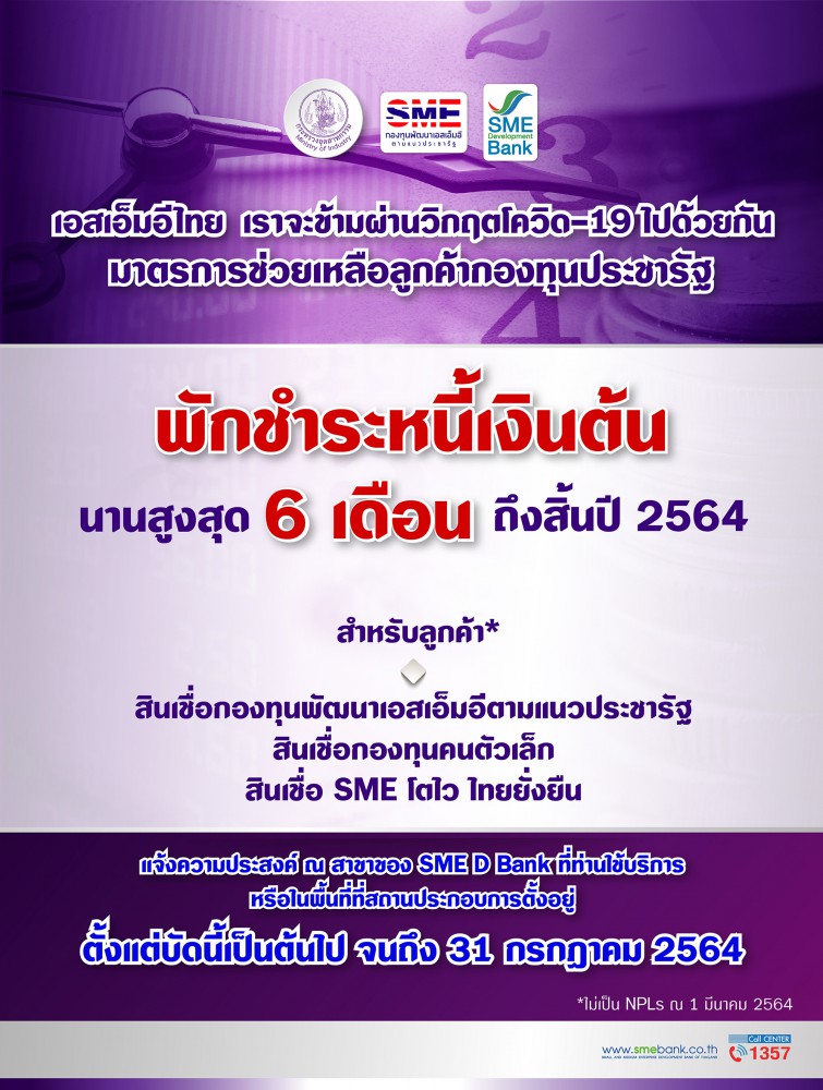 ส่วนลูกค้ากองทุนพัฒนาเอสเอ็มอีตามแนวประชารัฐ ที่ต้องการเข้ารับมาตรการพักชำระหนี้เงินต้น สามารถแจ้งความประสงค์ได้ ณ สาขาของ SME D Bank ที่ท่านใช้บริการ หรือในพื้นที่ที่สถานประกอบการตั้งอยู่ ตั้งแต่บัดนี้เป็นต้นไปจนถึง 31 กรกฎาคม 2564 นี้ สอบถามข้อมูลเพิ่มเติม Call Center 1357